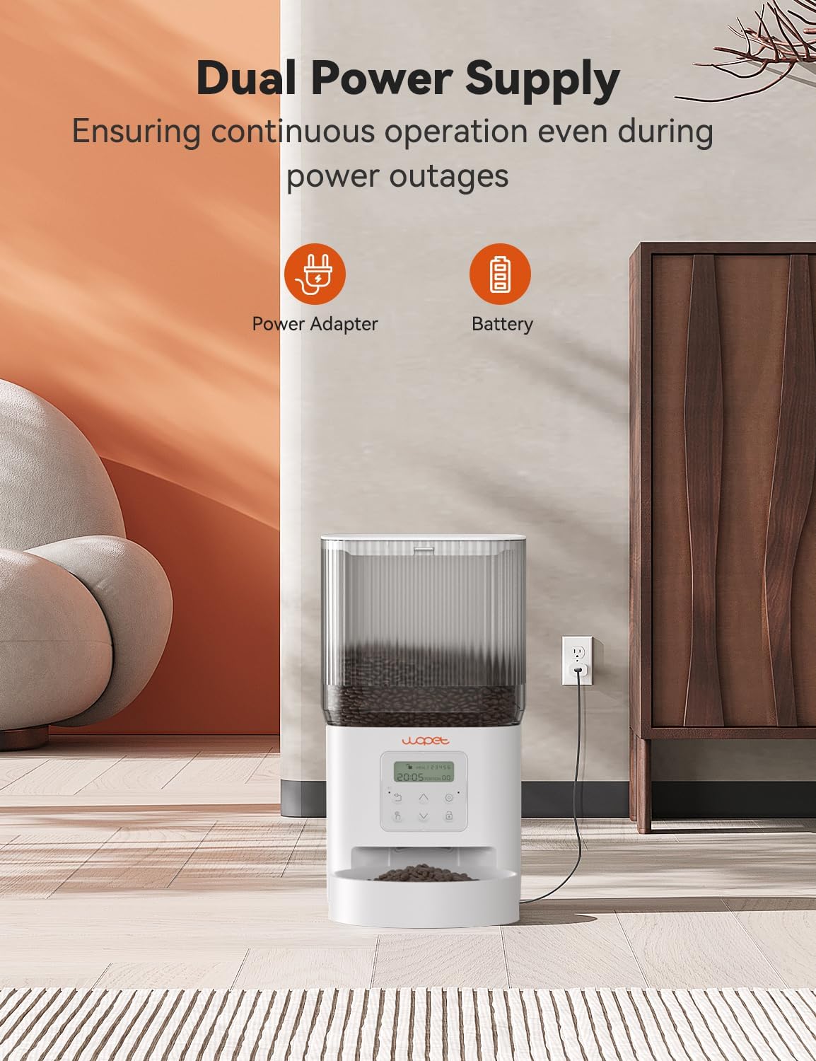 - Accurate Feeding Schedule: WOPET automatic cat feeder makes your life easier and more convenient. This cat food dispenser lets you program feeding plan for 1-6 meals per day, a meal with up to 8 portions (10g per portion). You won't have to worry about your pet going hungry while you're away for weeks. This reliable dog feeder ensures your pet is well-fed and content, no matter how long you're gone or travel.