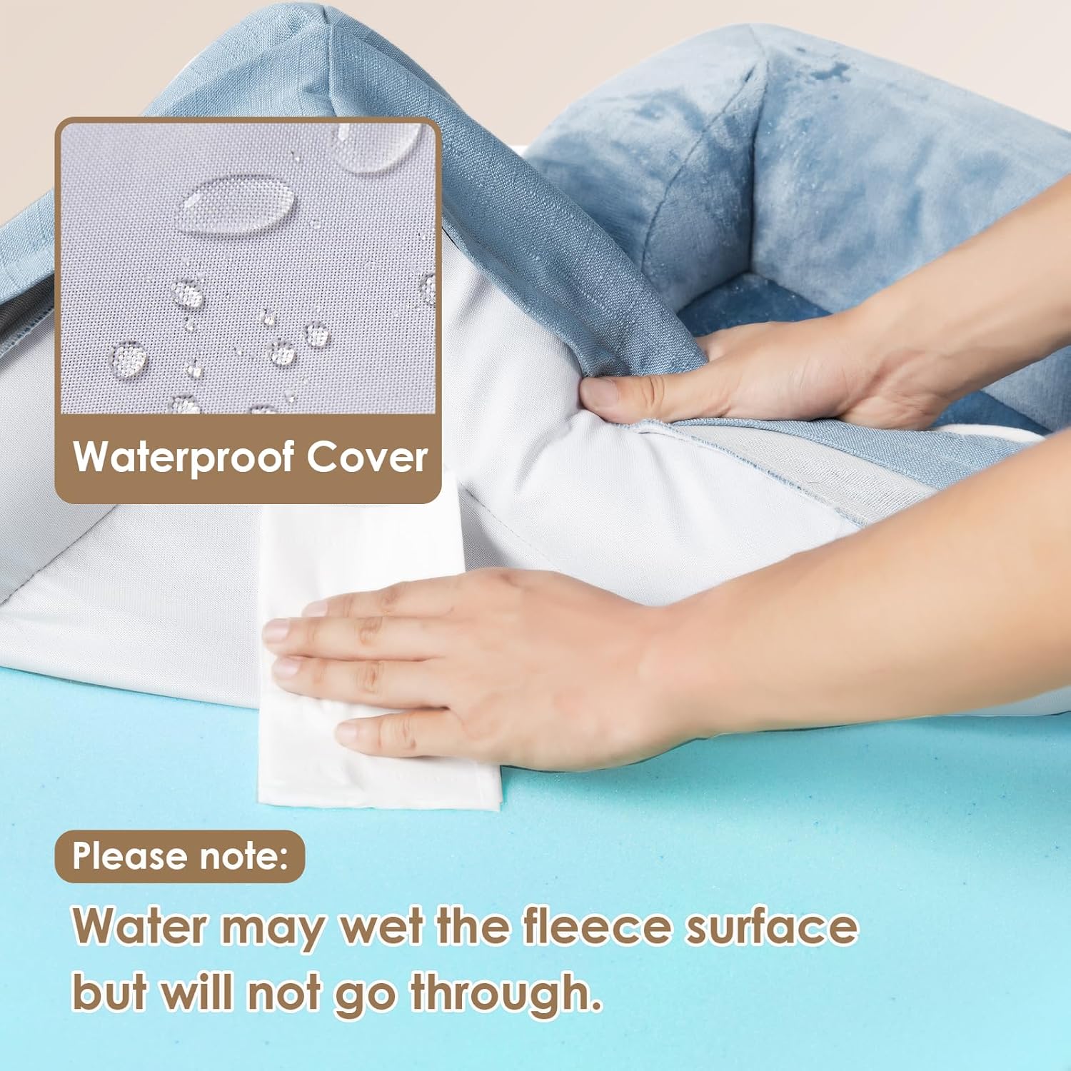 - WATERPROOF FILM and NON-SLIP BOTTOM: There is a waterproof film between the fleece surface and the bottom fabric that makes the dog bed waterproof. However, the faux linen on the side is not waterproof. A non-slip point on the bottom is not easy to slide, and keeps your dog bed steady.