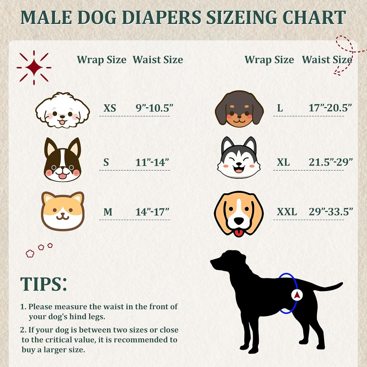 - Multi-sized and Easily Adjustable: Male dog nappies are available in 6 sizes: XS, S, M, L, XL, and XXL. Checking the size chart before placing an order is a good way to get the correct size.There are three sticking methods you can adopt depending on the size of your dog. If your dog's waist measurement is between two sizes or close to the threshold, it is recommended to buy a larger size.
