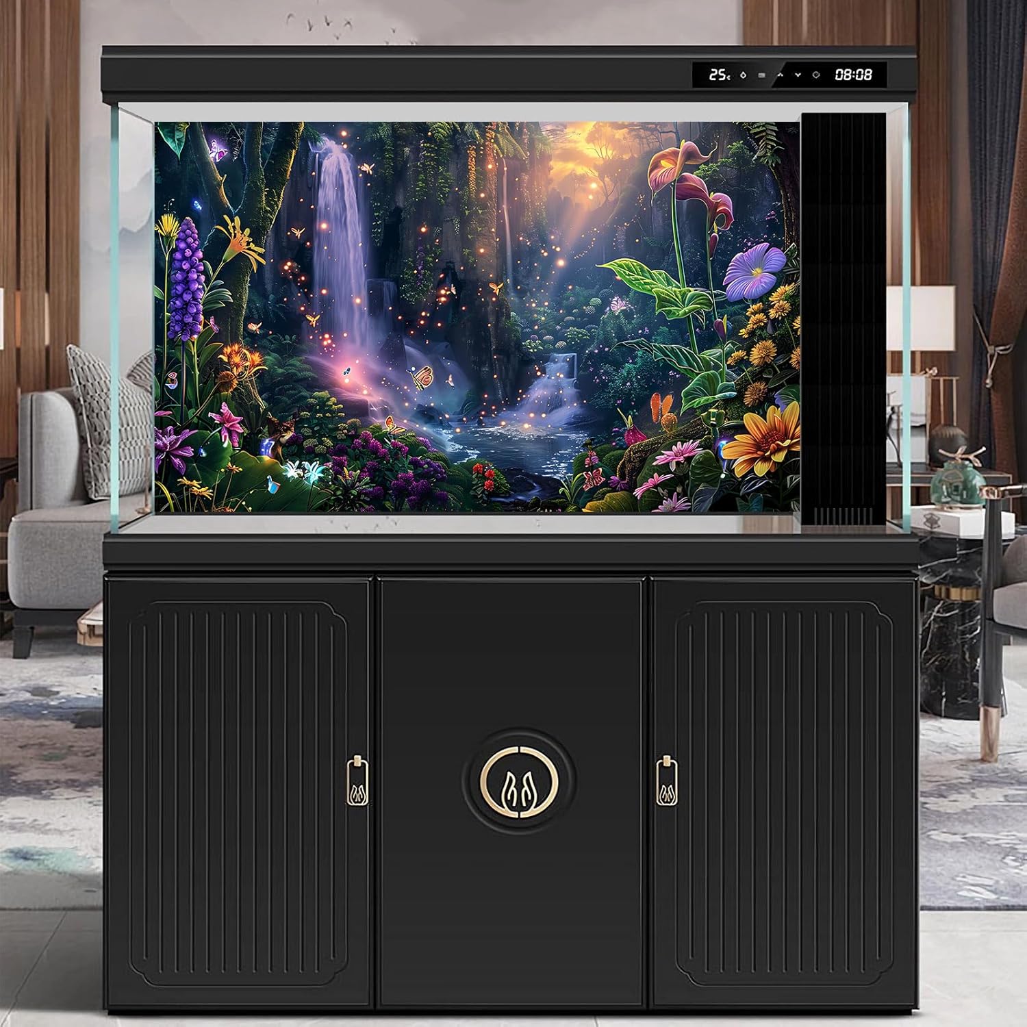 Fantasy Garden Aquarium Background Sunset Waterfall and Flowers Terrarium Backdrop Tropical Forest Lush Plant Magic Butterfly Lights Flowers Fish Tank Background Poster Decorations 48x24in