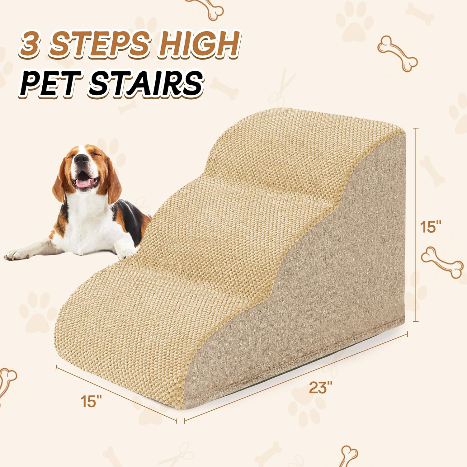 Romrol Dog Stairs Ramp for High Beds Couches, High Density Foam Pet Steps with Durable Non-Slip Waterproof Fabric Cover, Dog Stairs for Small Dogs or Cats or Pets, 3-Step,15 Inch,Beige