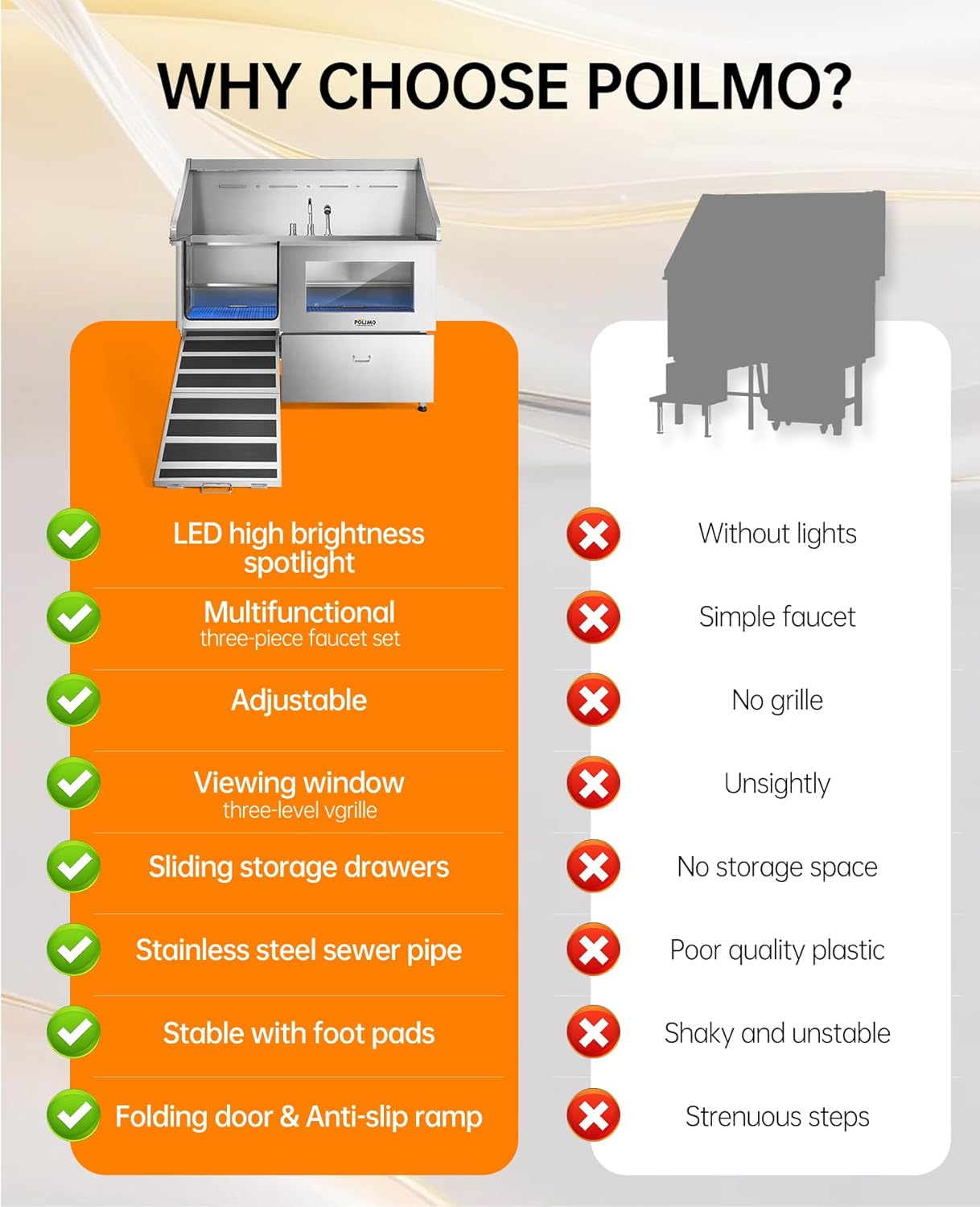 - Innovative and Practical Design: The POLIMO dog grooming station features multiple outstanding design elements: ① IP65 Waterproof high-brightness LED spotlight. ② Grade A tempered glass observation window. ③ The bathtub’s side panels feature a curved slide design, making it easier to operate④ Two-piece floor grid, adjustable to three different heights. ⑤ Sliding storage drawer for organized storage. ⑥ Multi-function faucet and showerhead, adjustable to left, center, or right positions.⑦ Two drainage options are available: one with a pet hair catcher and another stainless steel drain pipe featuring an odor-blocking S-trap design