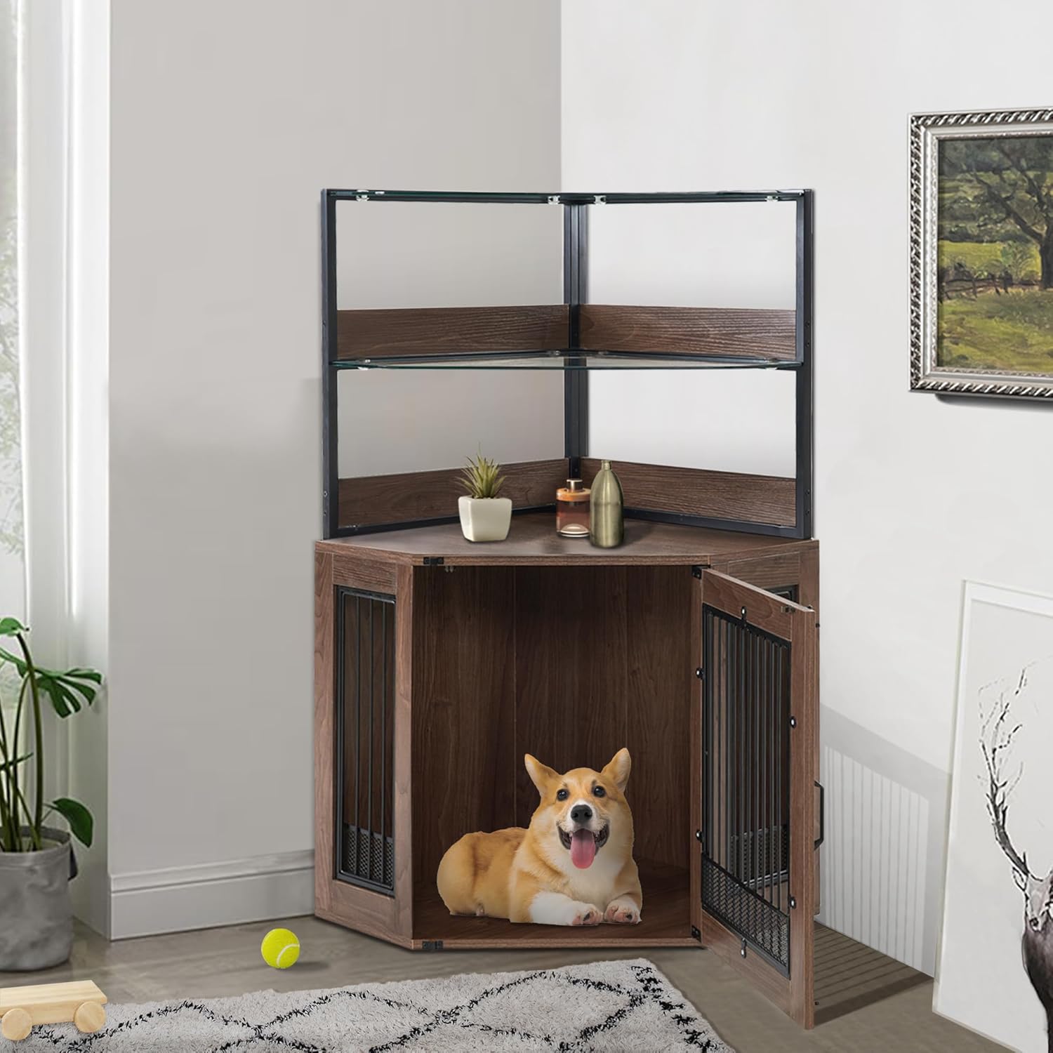 MCombo Small Corner Dog Crate Furniture with Glass Shelves, Wooden Dog Kennel Furniture with Door, Pet Crate Indoor Use, CN17 (Brown)