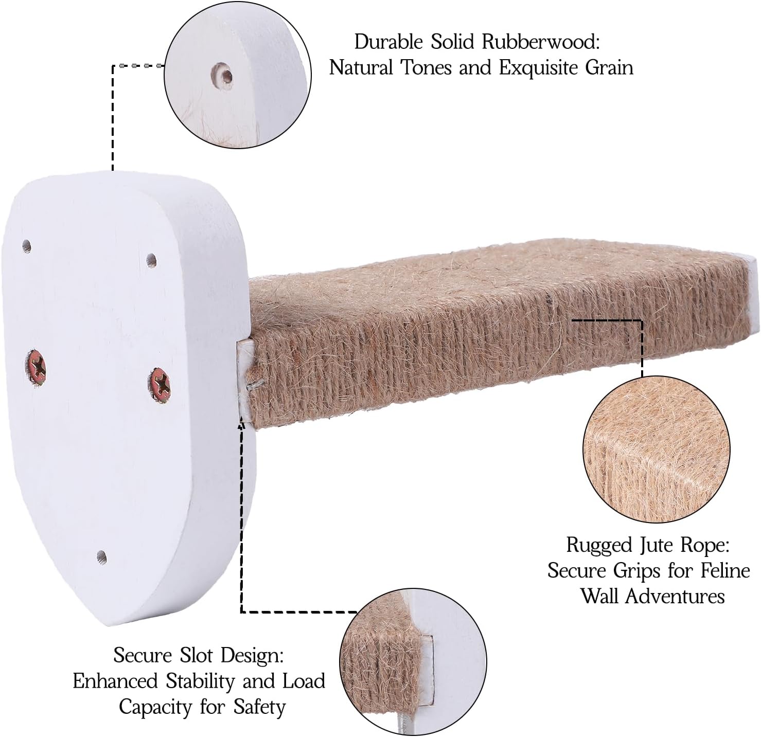 - 【Multifunctional cat wall furniture】This 3-piece set of cat wall steps is made of natural rubber wood, which is strong and stable. It not only meets the needs of cats for climbing and playing, but also, with its unique sisal rope covering design, provides an ideal scratching experience for cats. Whether used as an independent cat wall furniture or matched with other cat wall accessories, it can create a perfect activity space for your beloved cat.