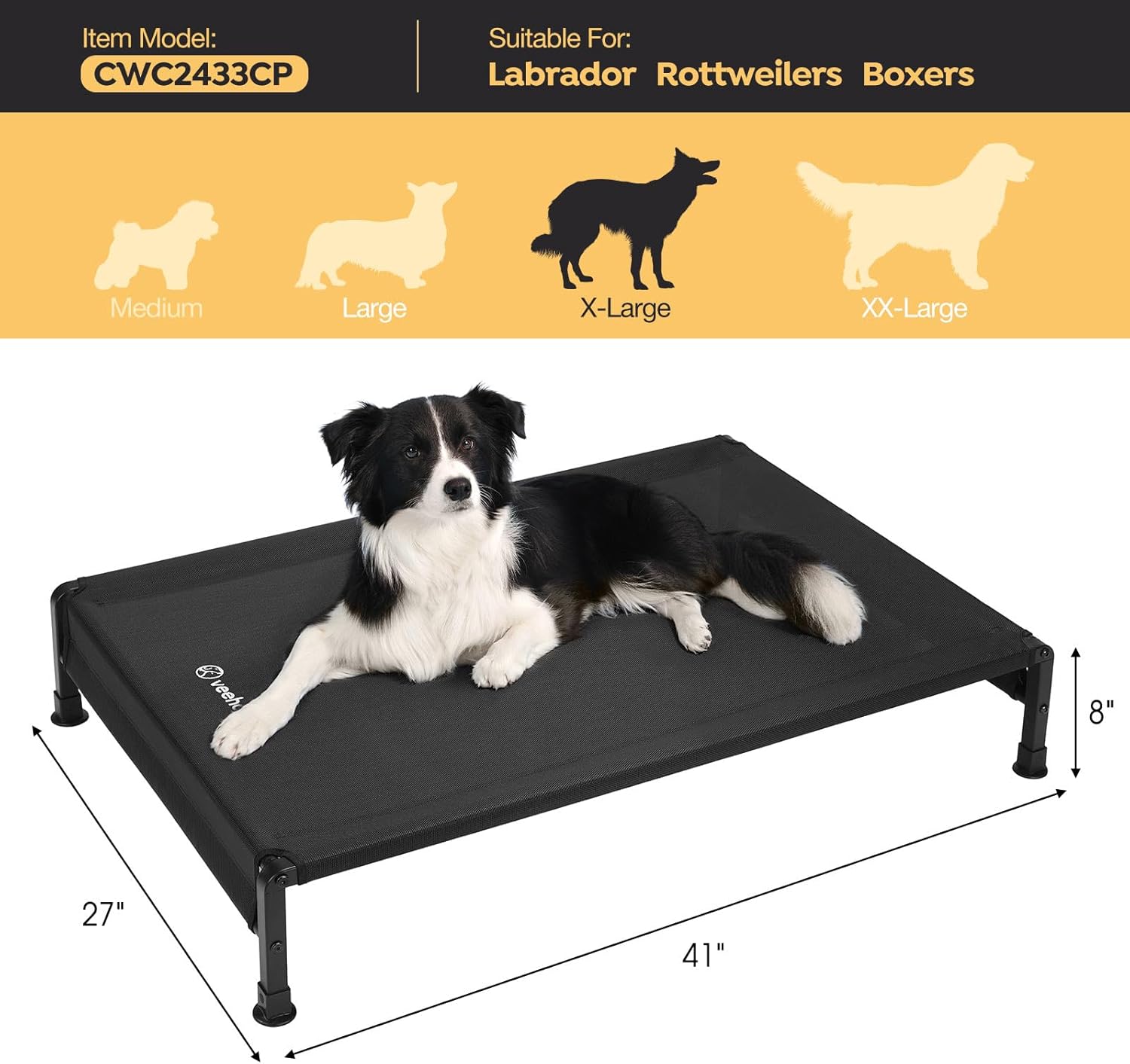 Veehoo Cooling Outdoor Dog Bed, Heavy Duty Elevated Pet Bed with Washable & Breathable Teslin Mesh, Non-Slip Silicon Feet, Dog Cot Bed with Support Hem, 41" x 27", Black, CWC2433