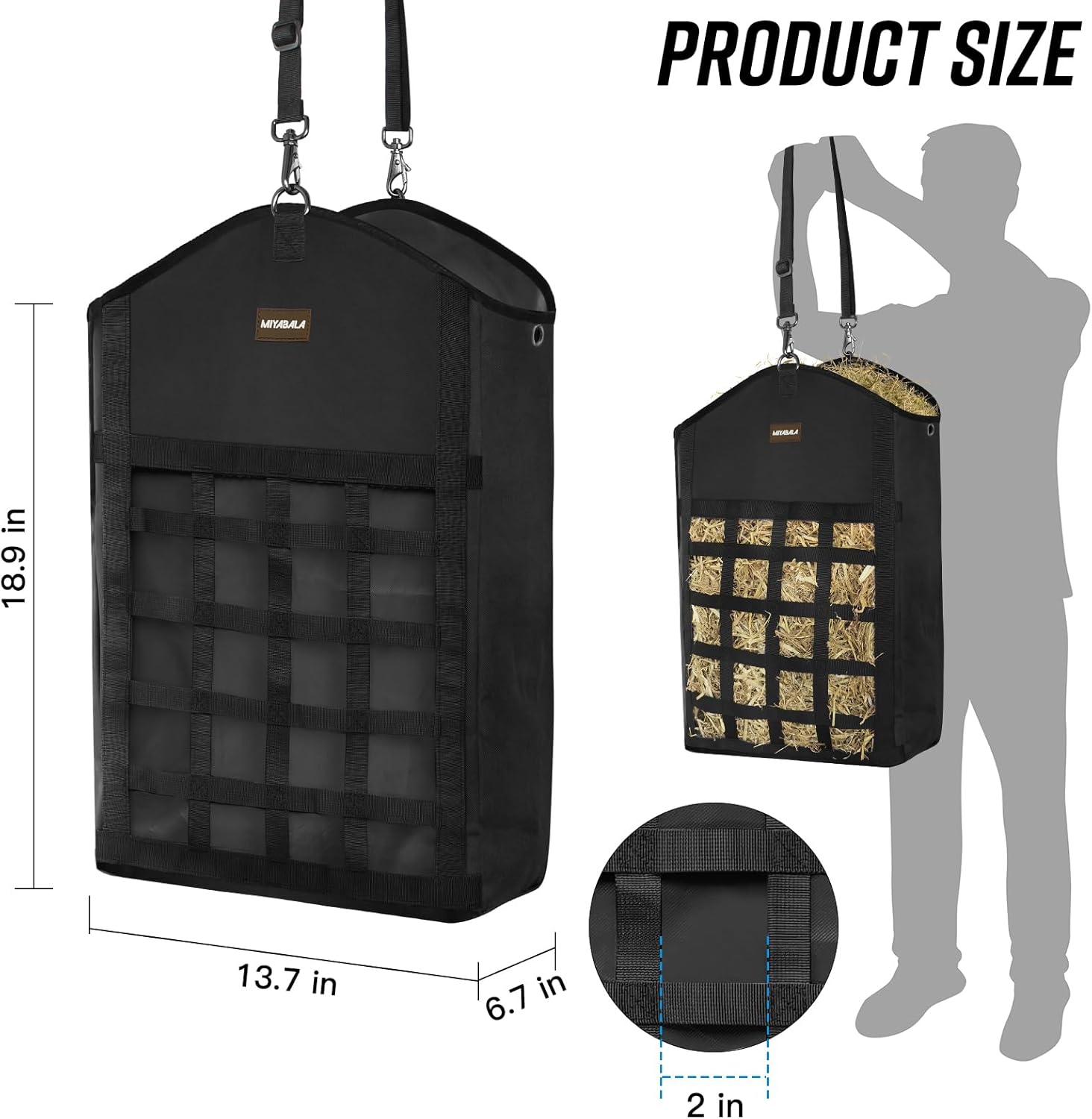 - Innovative Slow Feed Net: Featuring an innovative slow feed hay feeder for horses on the front panel, these horse hay bags promote healthy eating habits for horses. This design helps to regulate hay consumption, encouraging natural grazing behavior while preventing overeating, thereby supporting digestive health and overall well-being.