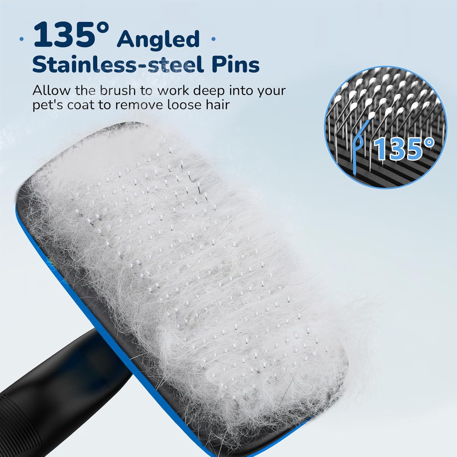 - EFFICIENT FUR REMOVAL, GENTLE ON YOUR PET'S SKIN : The pet hair brush is designed with fine 135° stainless steel bristles and gentle massage particles that effectively remove loose hair, dander, & dirt trapped beneath the fur without causing any discomfort or irritation to the pet's skin. Leave the pet's fur soft and shiny!