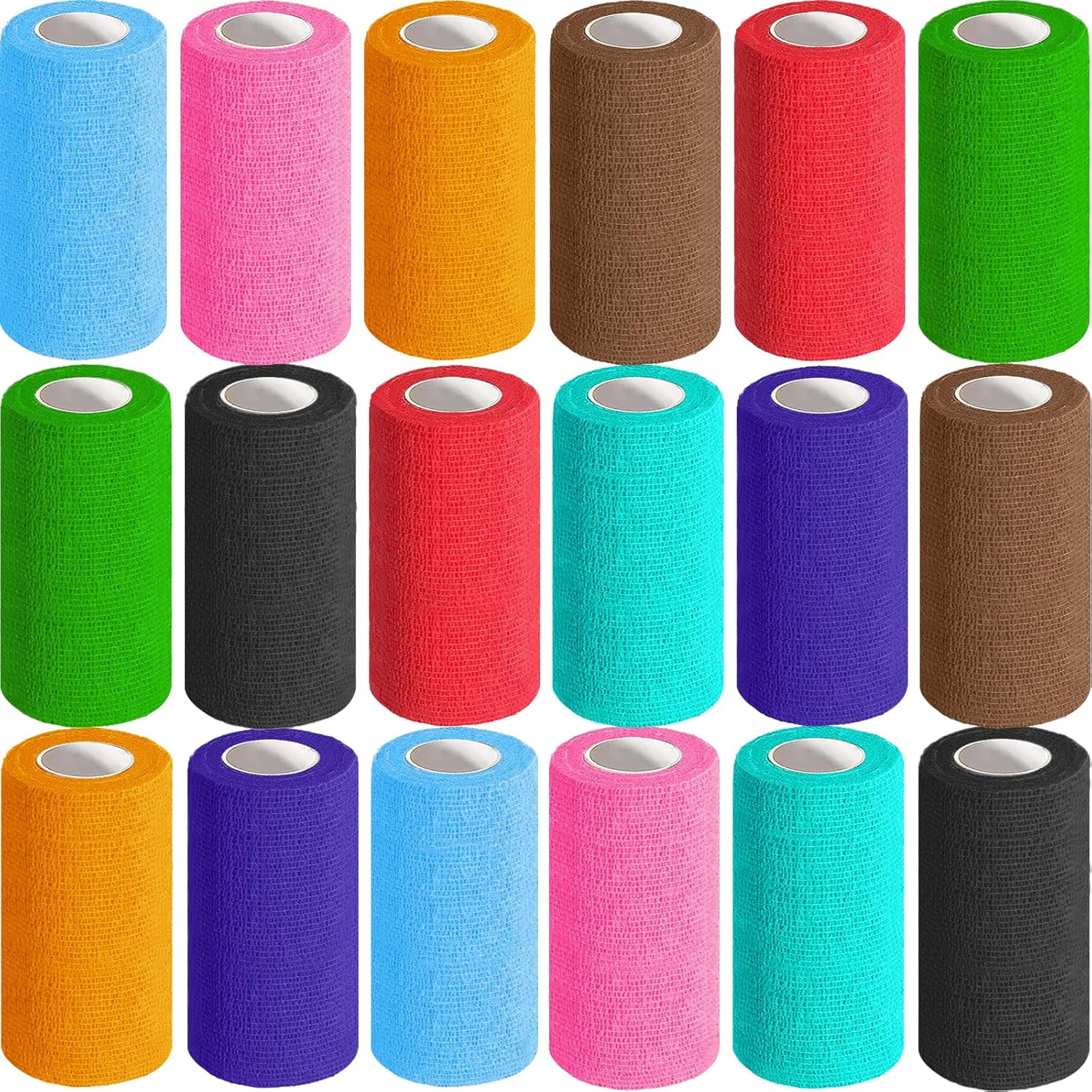 - Self Adhesive Bandage: Package includes 18 rolls of multi-color self adhesive bandage wrap. Each roll measures 4 inch wide and 5 yards long after stretching. It easily adheres to itself but will not stick to other surfaces such as skin or hair, making it easy to pull off and change bandages