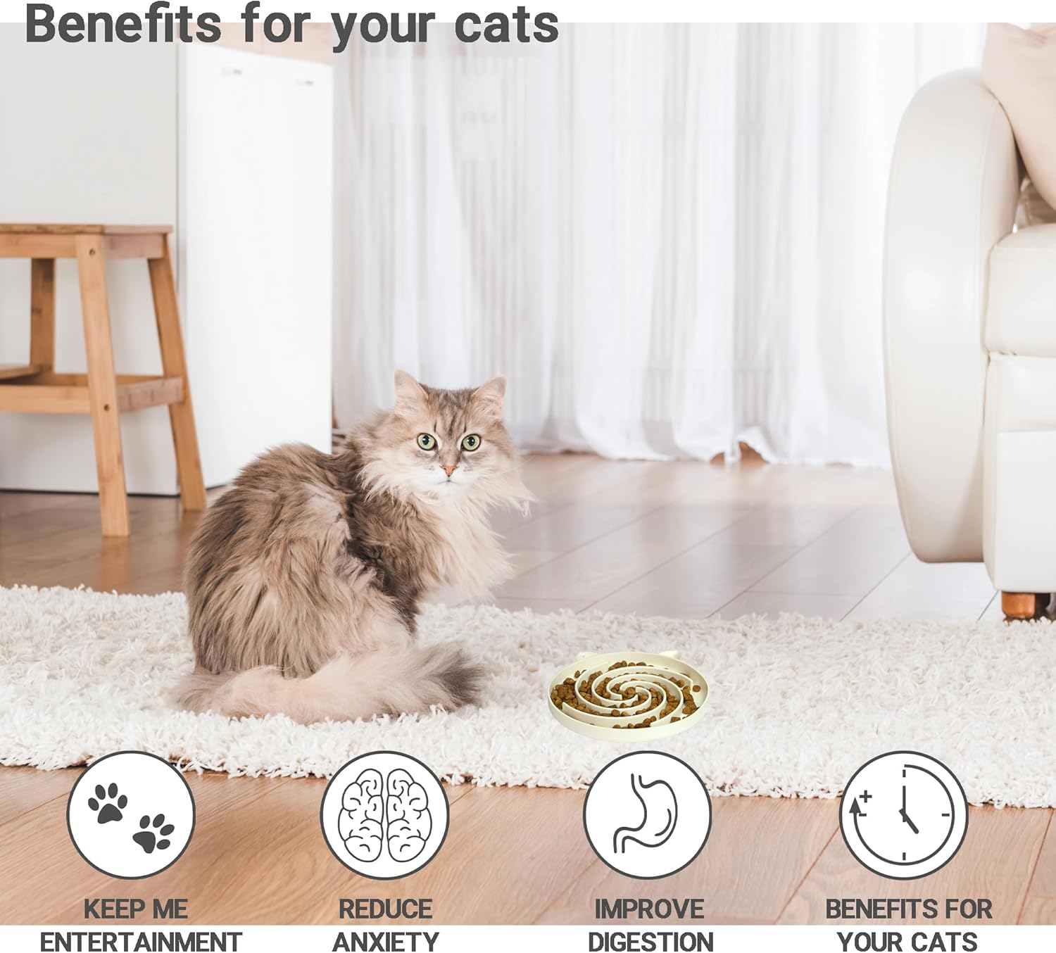 - Fun Slow Feed Bowl: The spiral pattern in our feeding bowl makes cats work for their food, as they need to navigate the curved channels to reach their meal. This design naturally slows down their eating pace, promoting better digestion while providing a more relaxed dining experience