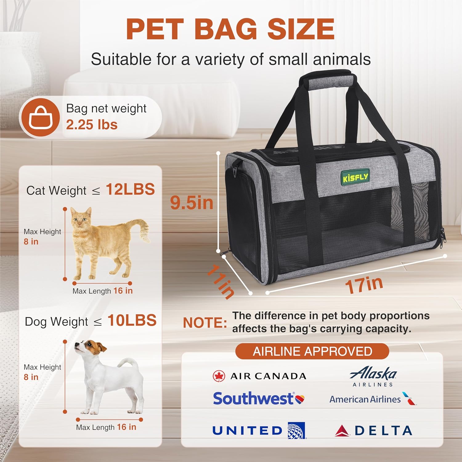 - PET CARRIER AIRLINE APPROVED: This airline under-seat pet carrier is mainly designed for American airlines, United airlines, Southwest airlines, Delta airlines ect. Although our pet carriers meet the limited sizes of most airlines, there are still some differences in the specific standards of each airline, please check with the airline before traveling.