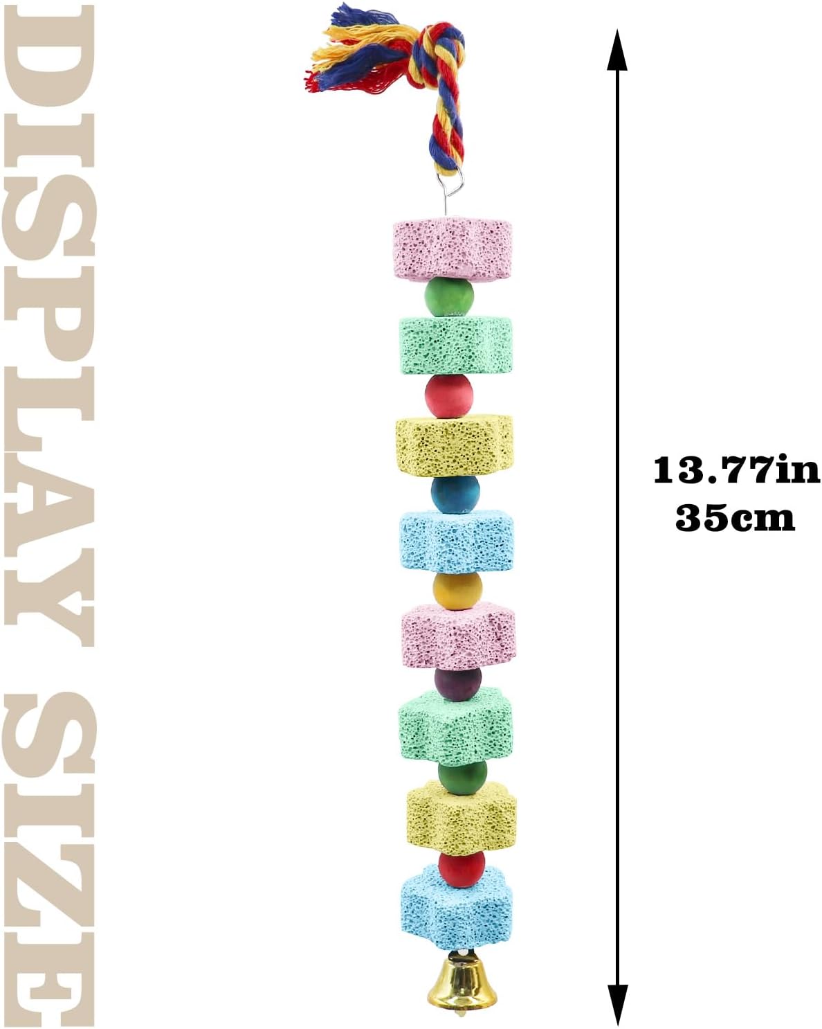 - Size and Install: The parrot calcium block toy package contains two bird teething stone toys, each bird chew toy length is 13.77"/35 CM. The top of each bird chewing toy is a colored cotton rope, you can easily hang the chew toy anywhere you want, and loading and unloading are very easy.
