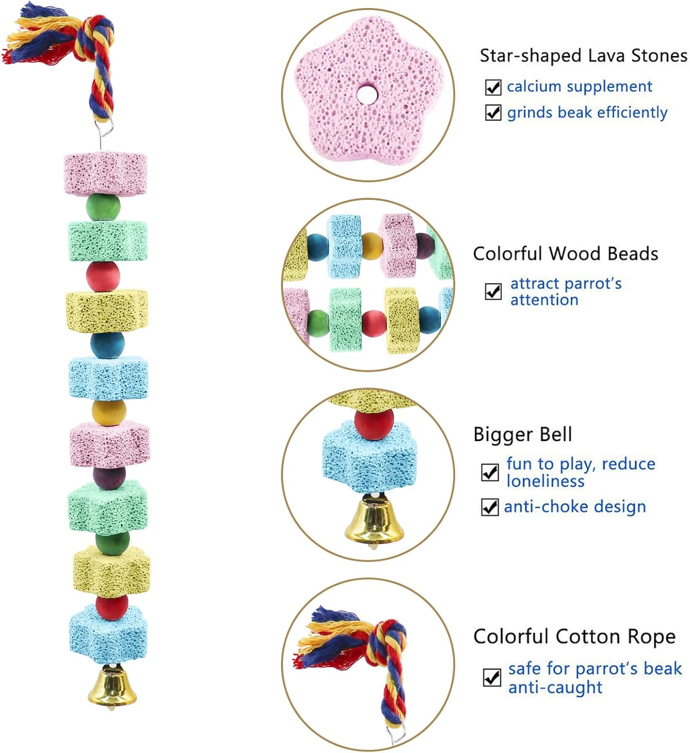 - Extra Long Parrot Chewing Toy: Compared to regular parrot chewing toy, our parrot chew toy is longer in size and hold more teething stones for longer use by more birds. The combination of calcium stones with different colors can not only attract birds to bite and play, but also decorate your birdcage.