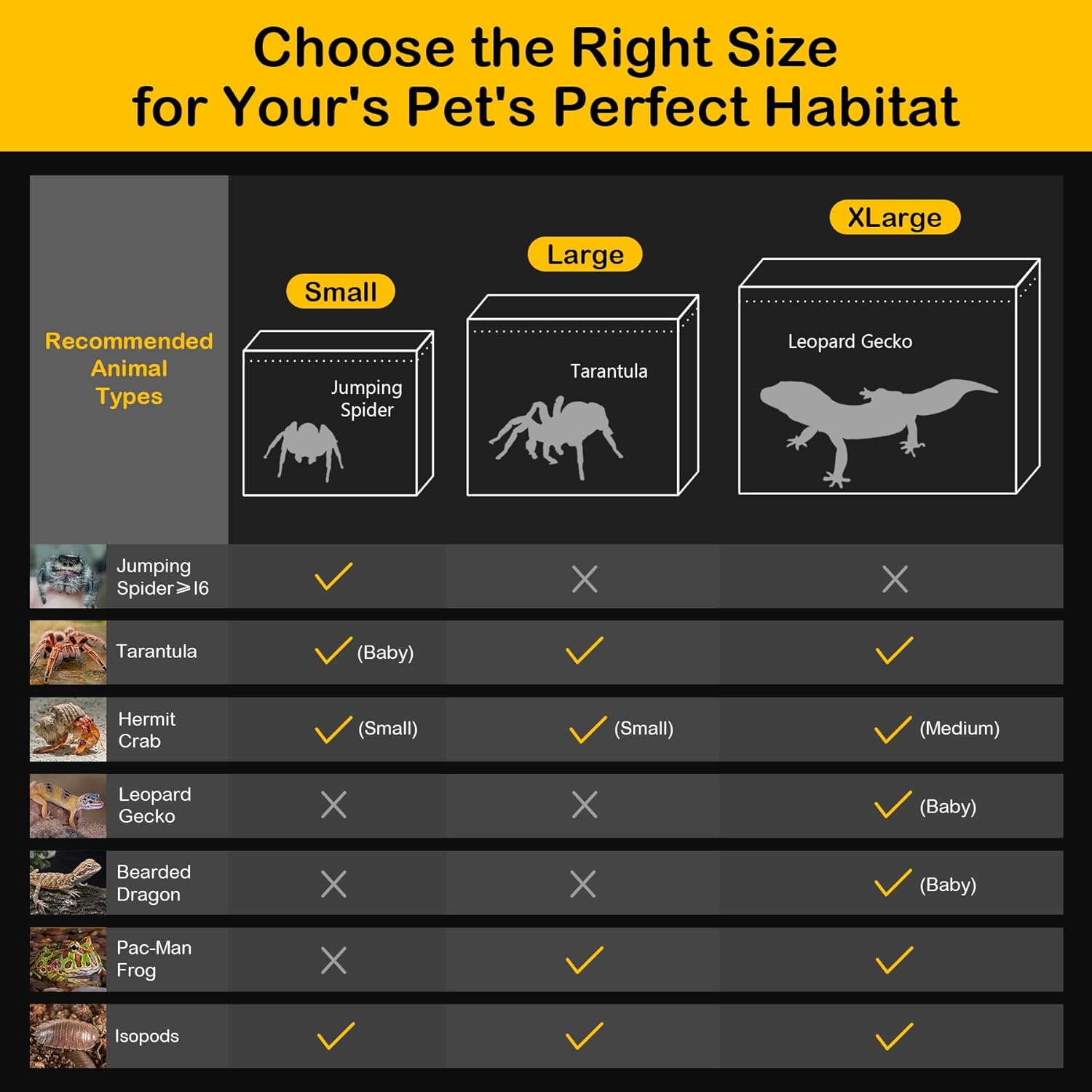 - Optimal Ventilation: With numerous ventilation holes on the top and sides, this reptile terrarium kit ensures optimal airflow for your pets.Perfect for housing small reptiles and insects such as chameleons, geckos, tarantulas, and hermit crabs