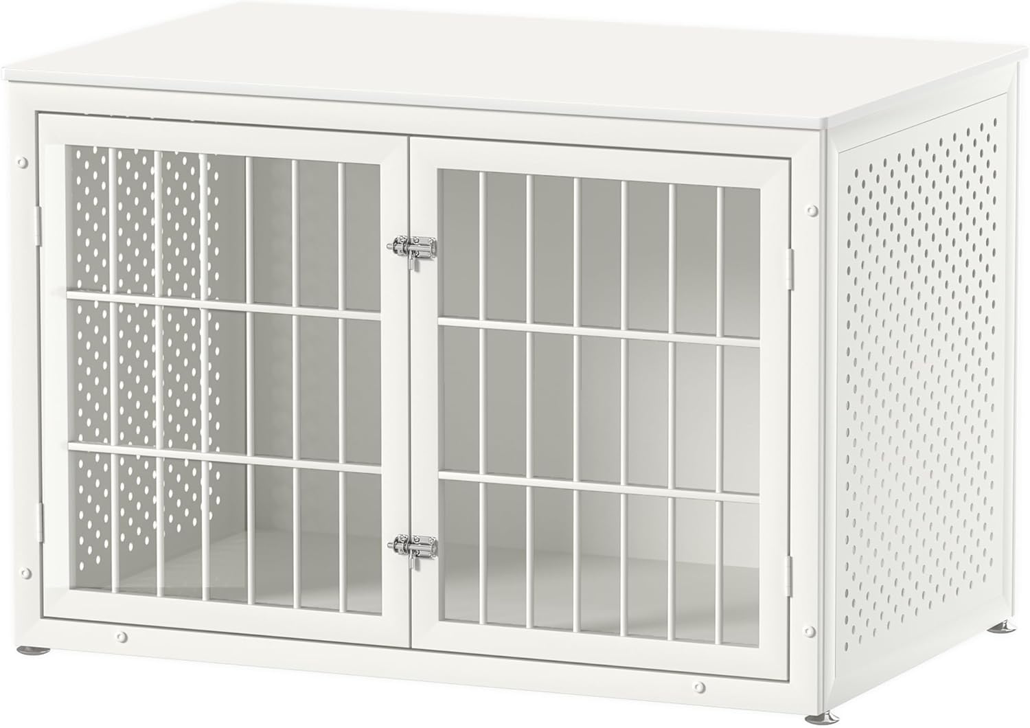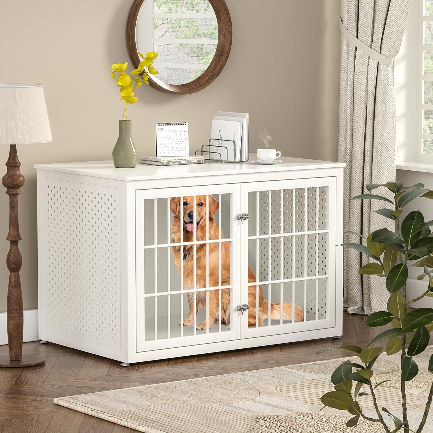 48" Heavy Duty Dog Crate Furniture for Large Dogs, Metal Cage for High Anxiety Dogs, Wooden Kennel Furniture Indoor, Decorative Dog Kennel End Table, XL,White