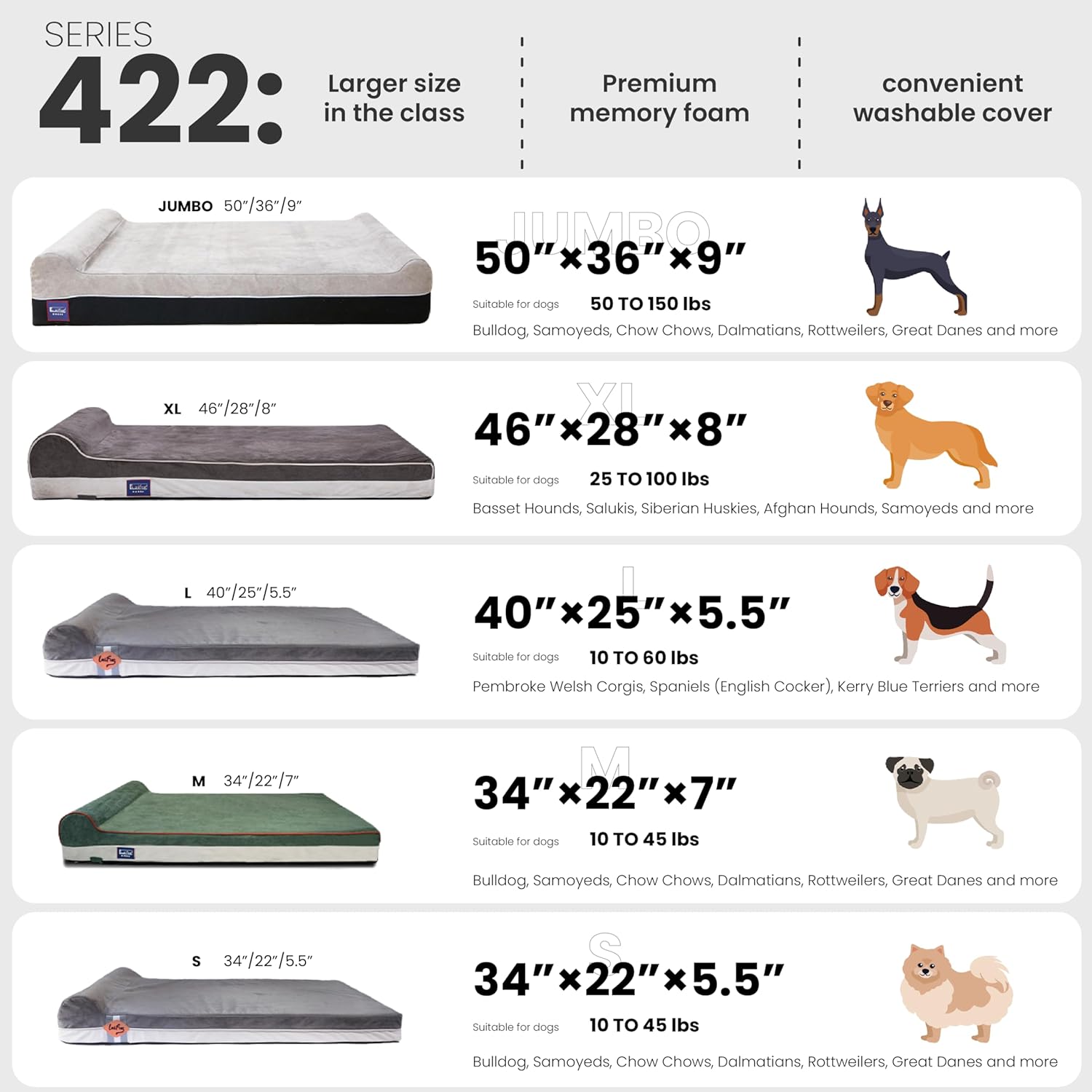 - Comfortable size:34”L x 22”w x 5.5”h Dimensions for dogs 75 pounds and under. Laifug foam bed will become your pets favorite sleeping spot.