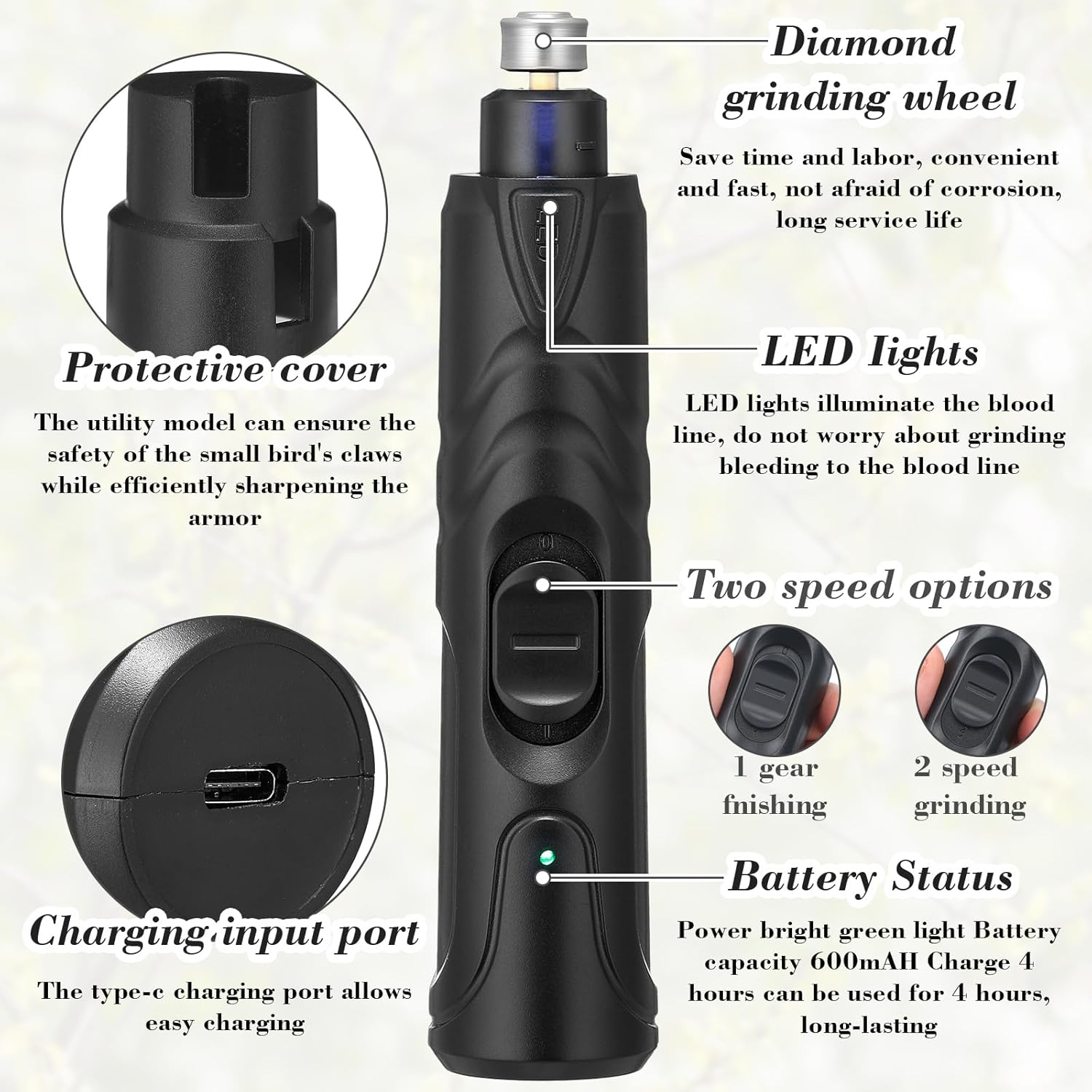 - Safe Nail Trimming Experiences: with a fitted LED lamp, this bird nail grinder gives you improved visibility for precision grooming; This feature helps you clearly find the blood line of the bird's nails, avoiding accidental harm during the grinding