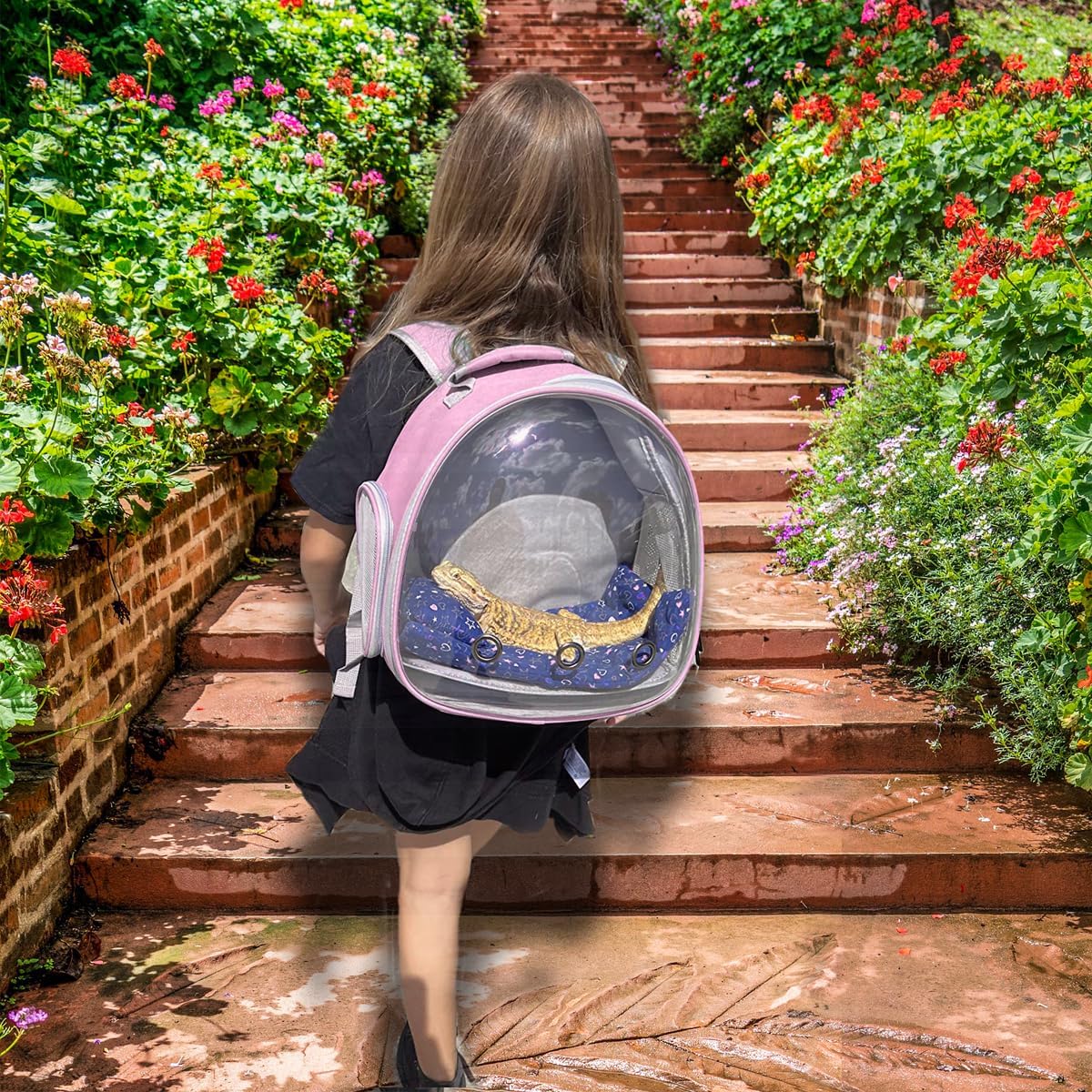 - The bearded dragon portable carrier backpack with leash is vented and breathable, crafted with breathable materials,side open window and pocket are made of anti-scratch mesh materials. 7 vents around the bubble carrier backpack,ensure sufficient air flow and allows lizard to breathe inside better.