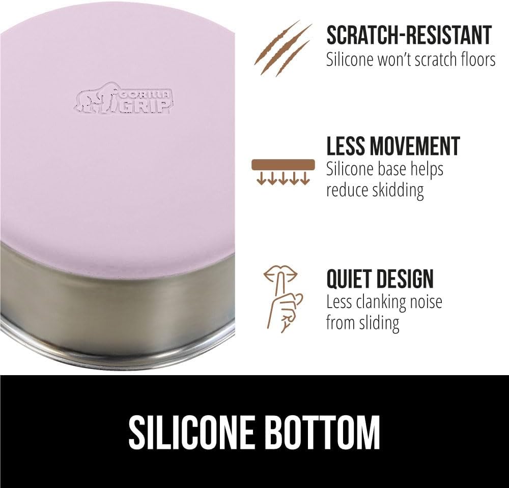 - SILICONE BOTTOM: the Gorilla Grip bowl is constructed from durable silicone that helps keep the bowl steady and won’t scratch your floors; while some over eager eaters may still be able to slide the bowls, the silicone will help prevent much movement; plus, it reduces the noise from clanking and sliding across wood, tile, and more