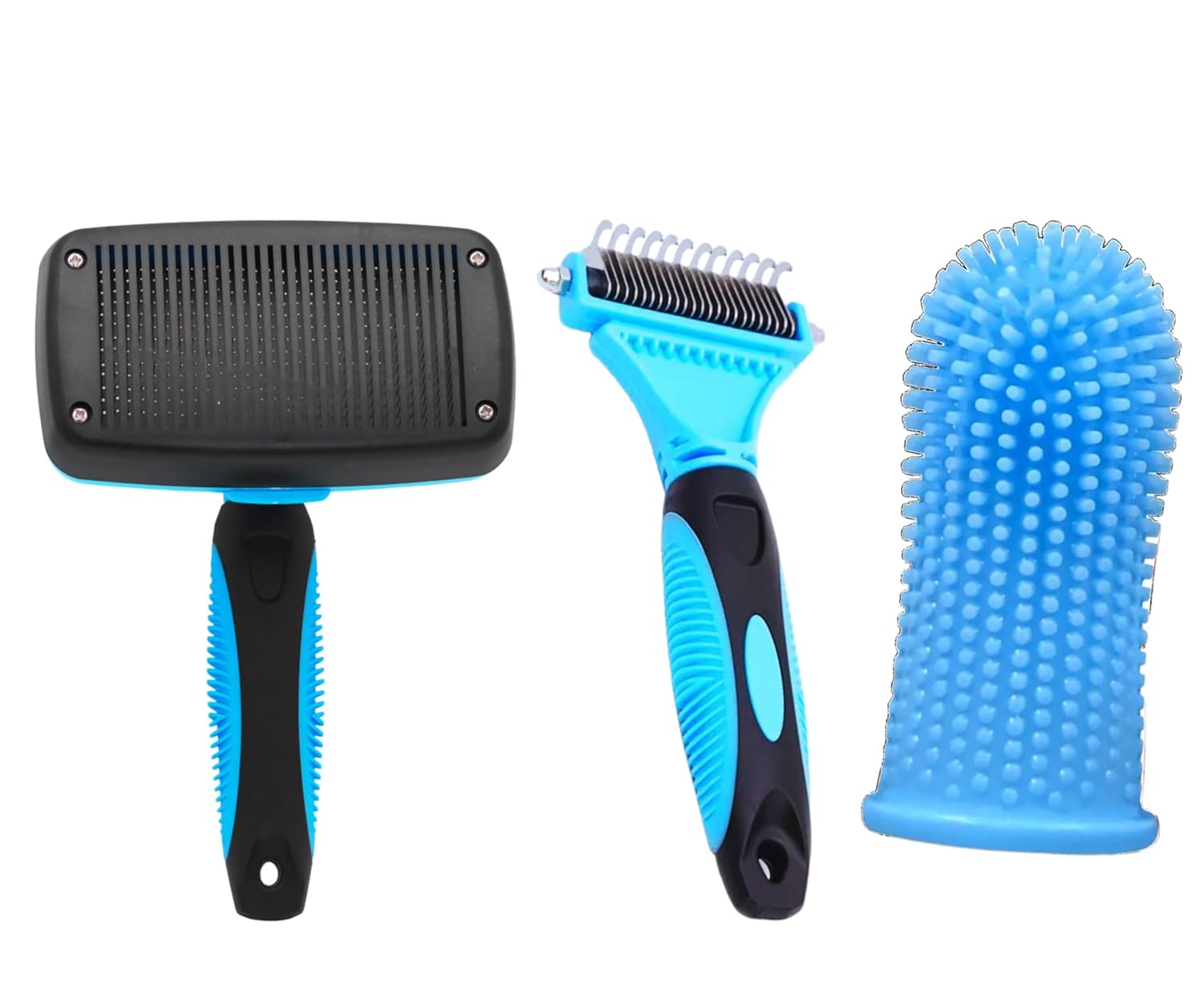 3-in 1 Dog & Cat Grooming Supplies- Self-cleaning Slicker Brush, Deshedding Rake Comb, And Finger Toothbrush For Dogs & Cats | Perfect For Pet Grooming Kit, Dematting And Dental Tool (blue)
