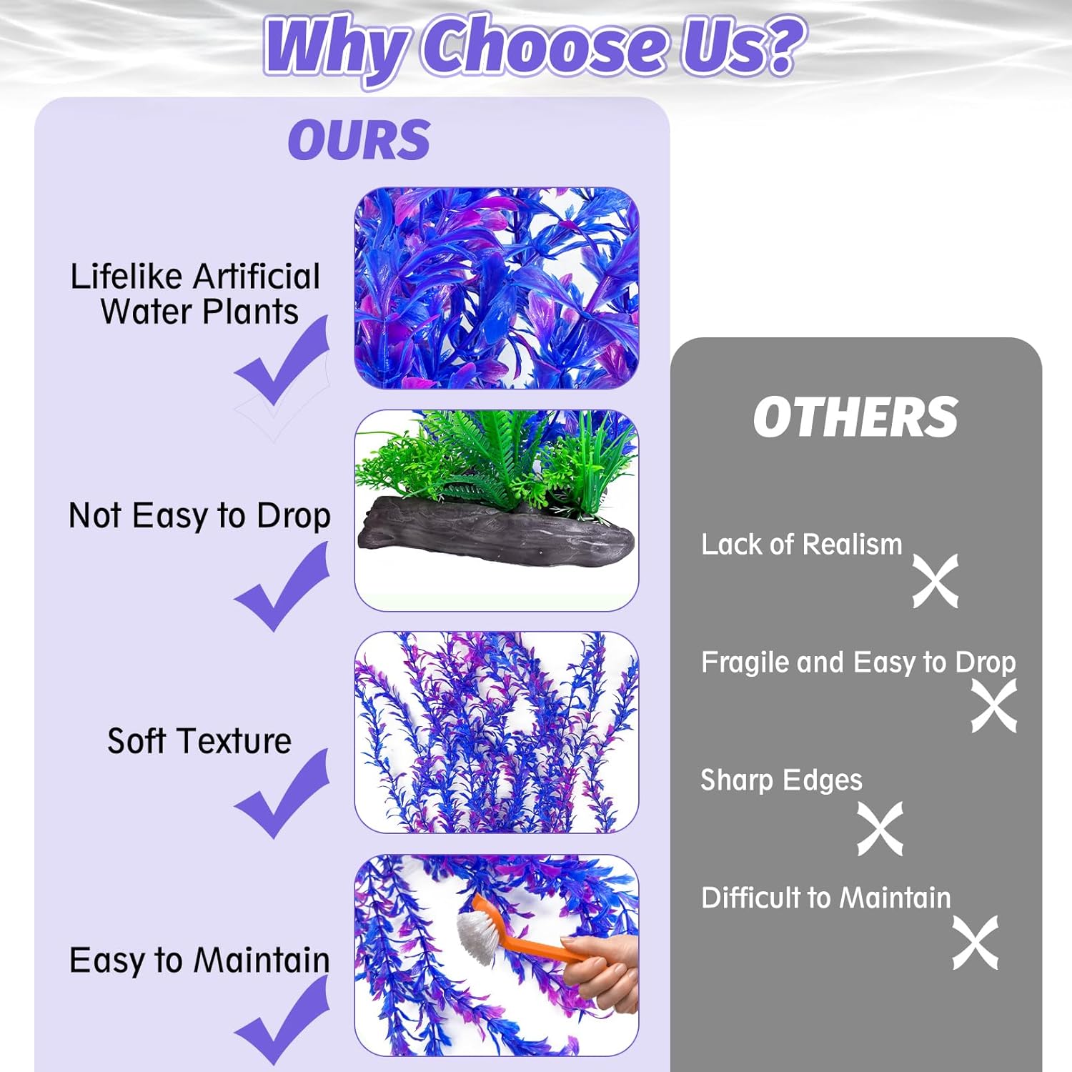 - RELIABLE MATERIAL OF FISH TANK DECORATIONS : Our fake water plant leaves and roots are made of soft plastic material that won't affect the water quality. The leaves do not have sharp edges and have a soft texture, which can effectively avoid any physical damage to the fish while swimming or playing, and aquarium decor can better beautify the e-nvironment, fish tank plants maintain stability and not fade. Fake aquarium plants provide a comfortable and clean living e-nvironment for fish. Whether placed in a saltwater e-nvironment or freshwater e-nvironment, aquarium plants plastic realistic can be perfectly adapted