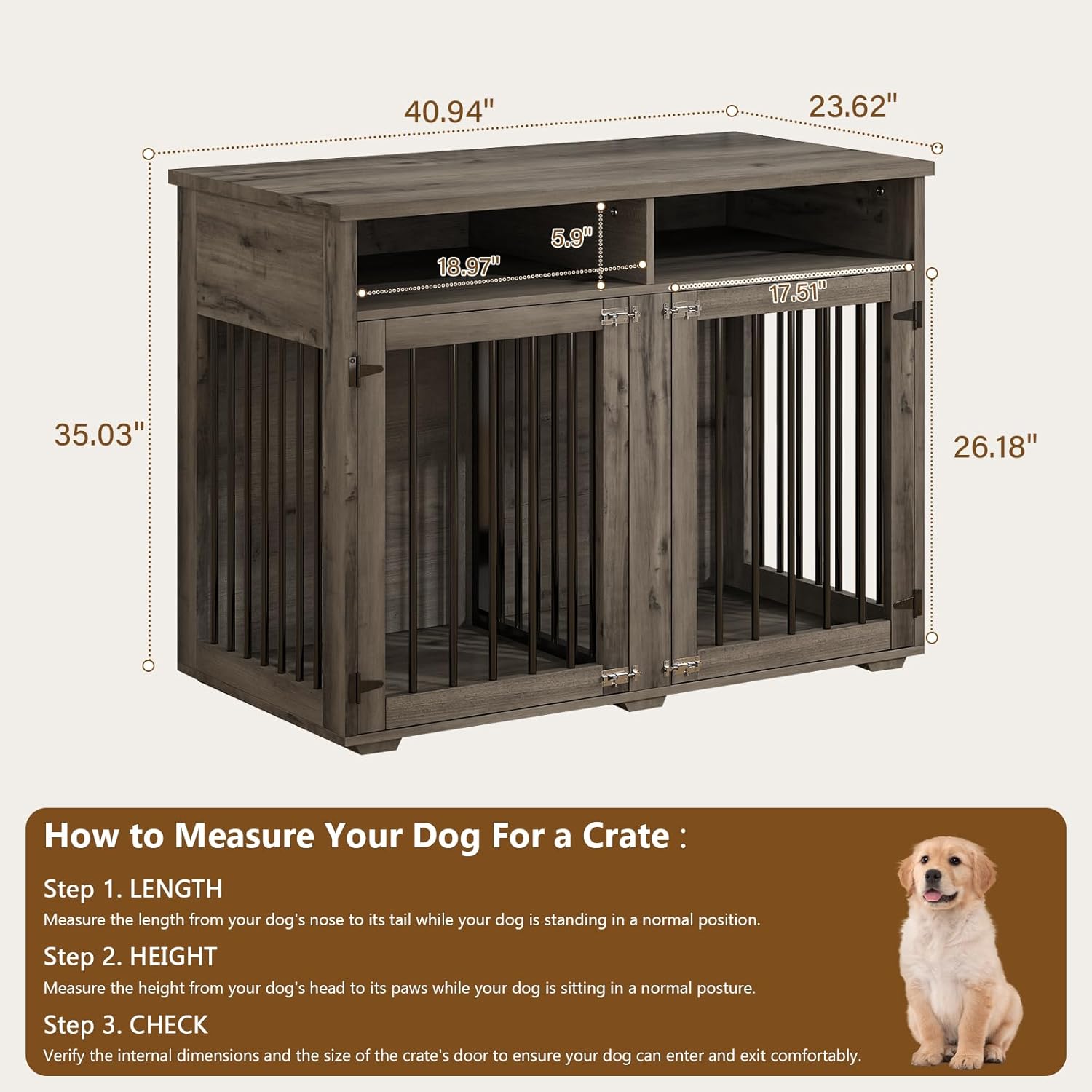 Furniture Dog Crate for 2 Dogs, 41 Inch Dog Kennel Furniture with Removable Divider and Shelf Storage, Wooden Dog Crate for Small/Medium Dogs, Grey