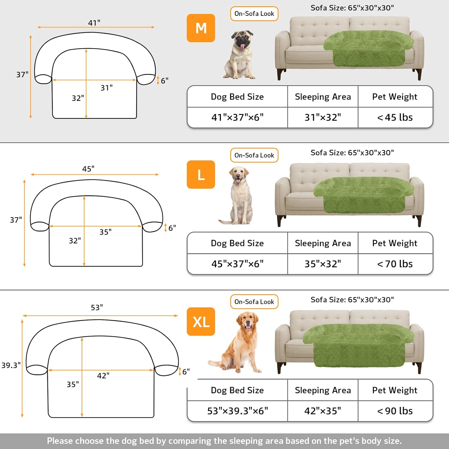 - 【Multiple Size Selection】The couch pet bed has 5 sizes for you to choose from. M: 41"x37" dog bed for medium dogs. L: 45"x37" dog bed for large dogs. XL: 53"x39.3" dog bed for large dogs. We have enlarged the sleeping area for pets to give dogs more space.