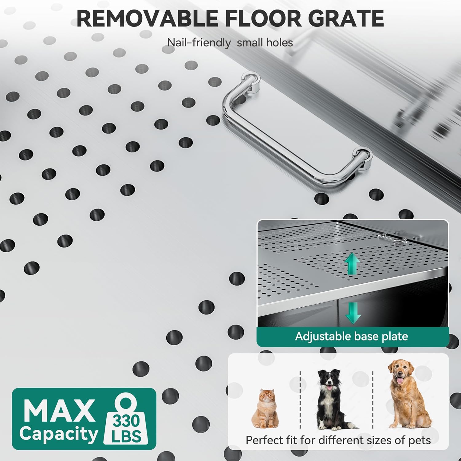 - Enhanced Drainage System: Our large pet wash station is designed with a chrome-plated extendable drain, offering durability and an aesthetic appeal; The two-tier adjustable floor accommodates pets of all sizes, providing a complete and enjoyable bathing experience; 3-speed adjustable shower head (max flow rate 2.0gpm)
