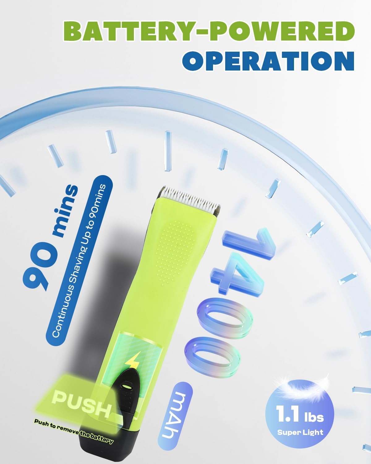 - [Dual Power Options Convenience]: Power Whenever, Wherever! This professional horse shear packs a punch with its 7.4V, 1400mAh lithium battery, delivering up to 90 minutes of uninterrupted grooming in a quick 2-hour charge. And hereās the kickerāthis pet clipper hooks up to a 3.5-meter-long charging cable, so you can groom on the go without ever pausing to recharge. No more cord-induced shackles, just pure, uninterrupted grooming freedom.