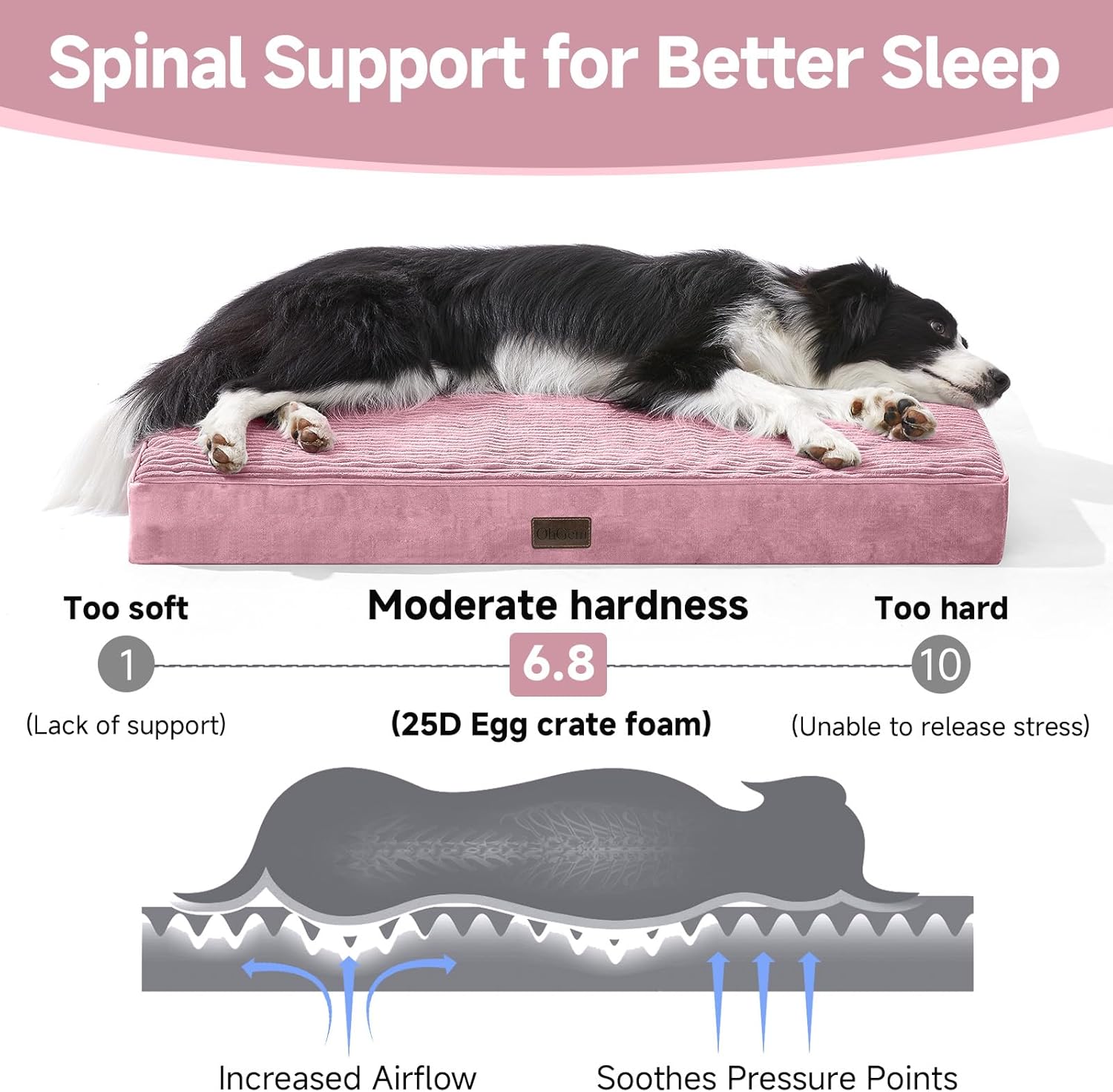 OhGeni Orthopedic Waterproof & Machine Washable Dog Bed for Medium Large Pets, Suitable for Crates, 25D Egg Crate Foam, Non-Slip Bottom & Removable Cover, Invisible Zipper, 35 Inches(Pink)