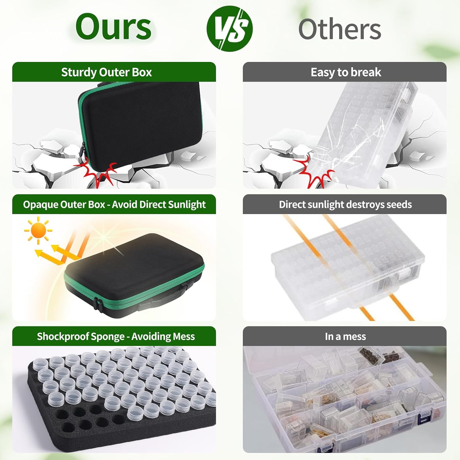 - Portable & Sturdy Carry Case: This portable seed saving box is made of high-quality EVA material which is water-resistant and very sturdy for long use. There is a convenient carrying handle so you can take the box with you wherever you go. A mesh pocket is perfect for managing all accessories and tools, and a double zipper is designed for more casual use. Keep all your seeds and seed supplies in one bag with the internal shockproof sponge.