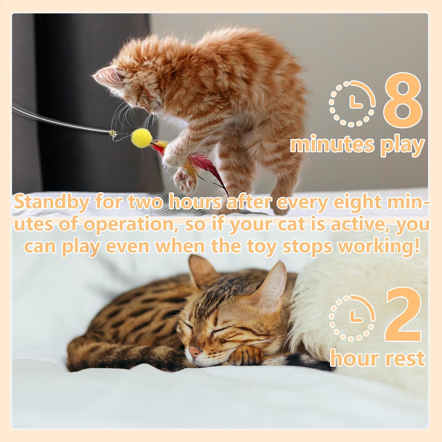 - Usb Rechargeable Battery:This automatic cat toy comes with a built-in rechargeable battery and includes a Type-C cable for easy charging. It fully charges in just 2-3 hours,Long-lasting life 600Ah battery is able to provide a longer use time, which is suitable for long hours of play without frequent recharging. To prevent overstimulation and keep your cat engaged,Automatic standby 2H after 8mins working,This feature helps your kitty rest after playtime, saving electricity and freeing your hands