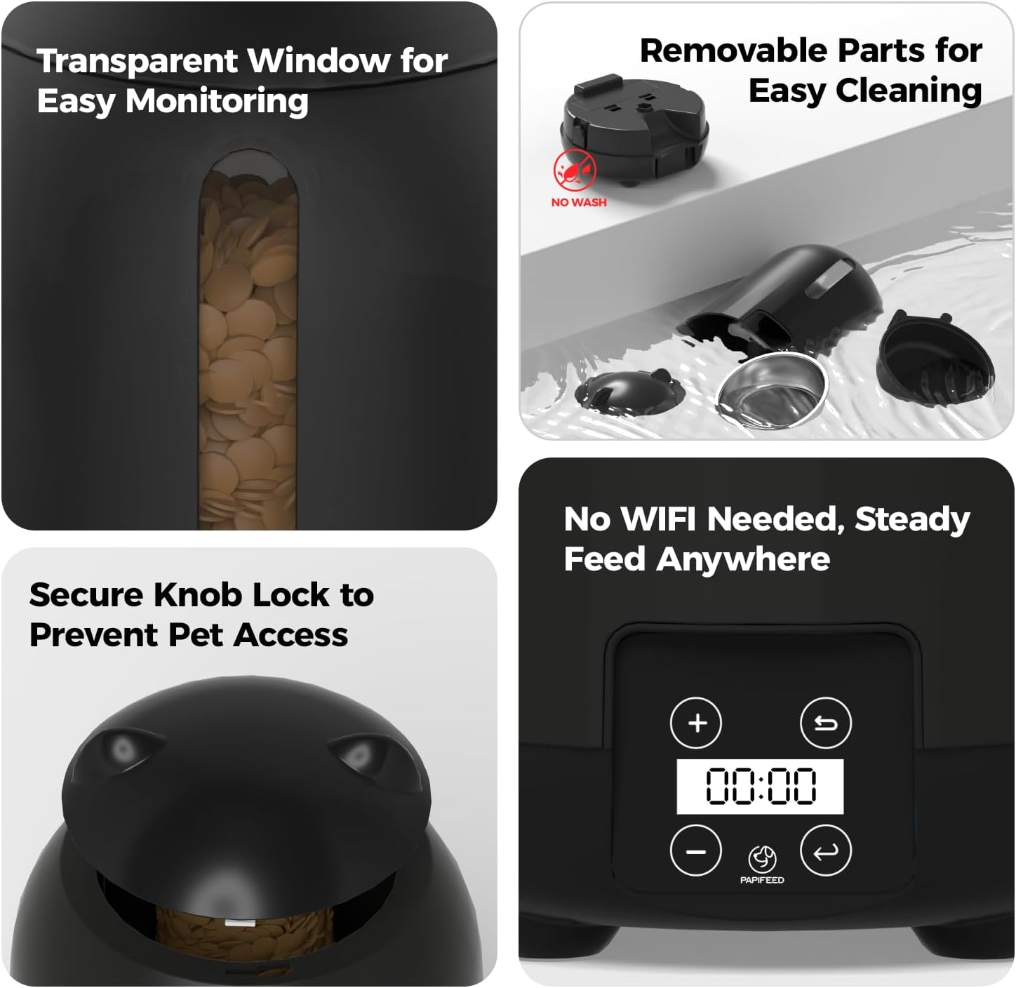 - 【PROGRAMMING TIMED FEEDING, SCIENTIFIC PET CARE】PAPIFEED auto cat feeder can customize healthy feeding schedule according to pet's needs. It can set 1-4 meals/day, 1-6 portions of food per meal, accurately control feeding amount, avoid overfeeding or starvation, and scientifically manage pet's diet and health. Even if you are on a business trip or traveling, the feeder will still strictly implement the set plan to ensure that your pet eats on time, so you can rest assured at any time.