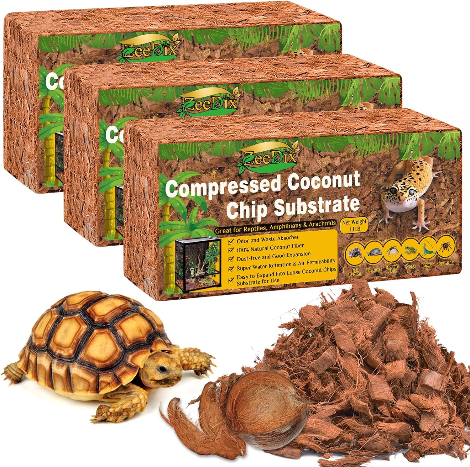 - What You Will Receive: You will get 3 PCS in 1.1 LB compressed coco coir chip brick. It will expand into loose coco chips after water absorption, each loose coco chips is about 10 mm ~ 35 mm, which is an ideal coconut substrate for reptiles