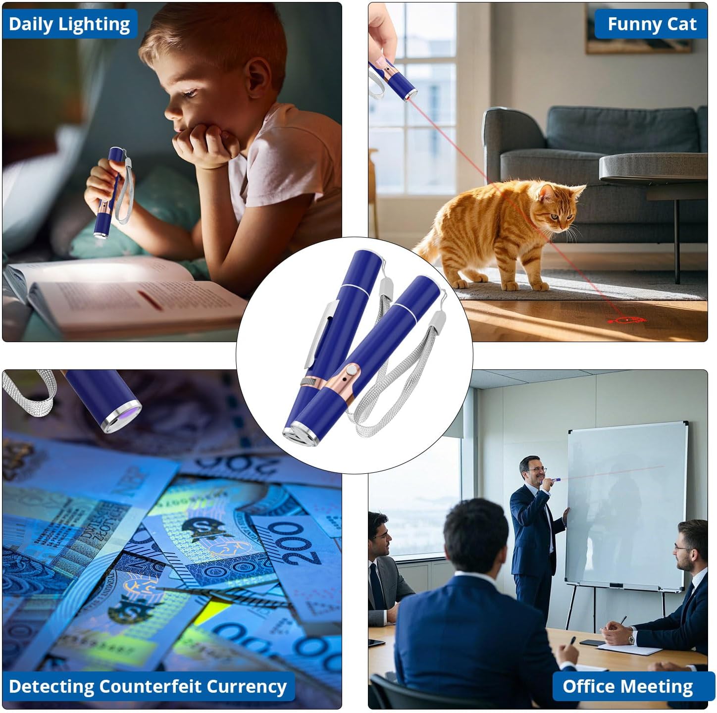 - Multiple Function: The cat toy can also make you a presenter. It is very bright. Plus, you can turn on the switch with a single press. White mode can glow in the dark; Purple mode can detect money.