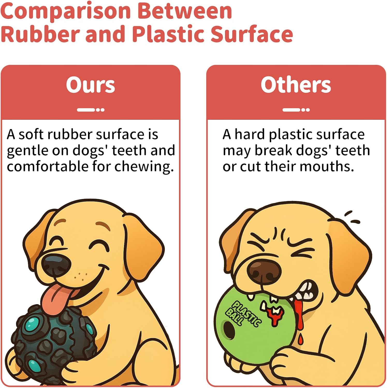 - Teeth Cleaning for Large Dogs - The outer rubber surface is durable yet remains soft and gentle on dogs' teeth and comfortable for chewing. By comparison, some popular squeaky balls use hard plastic surfaces, which may break dogs' teeth or cut their mouths. Our squeaky ball features meteorite-shaped nubs on its rubber surface, designed to help clean teeth and remove food stuck. You can also apply toothpaste on the JoyBruko dog ball to help furries keep dental health!