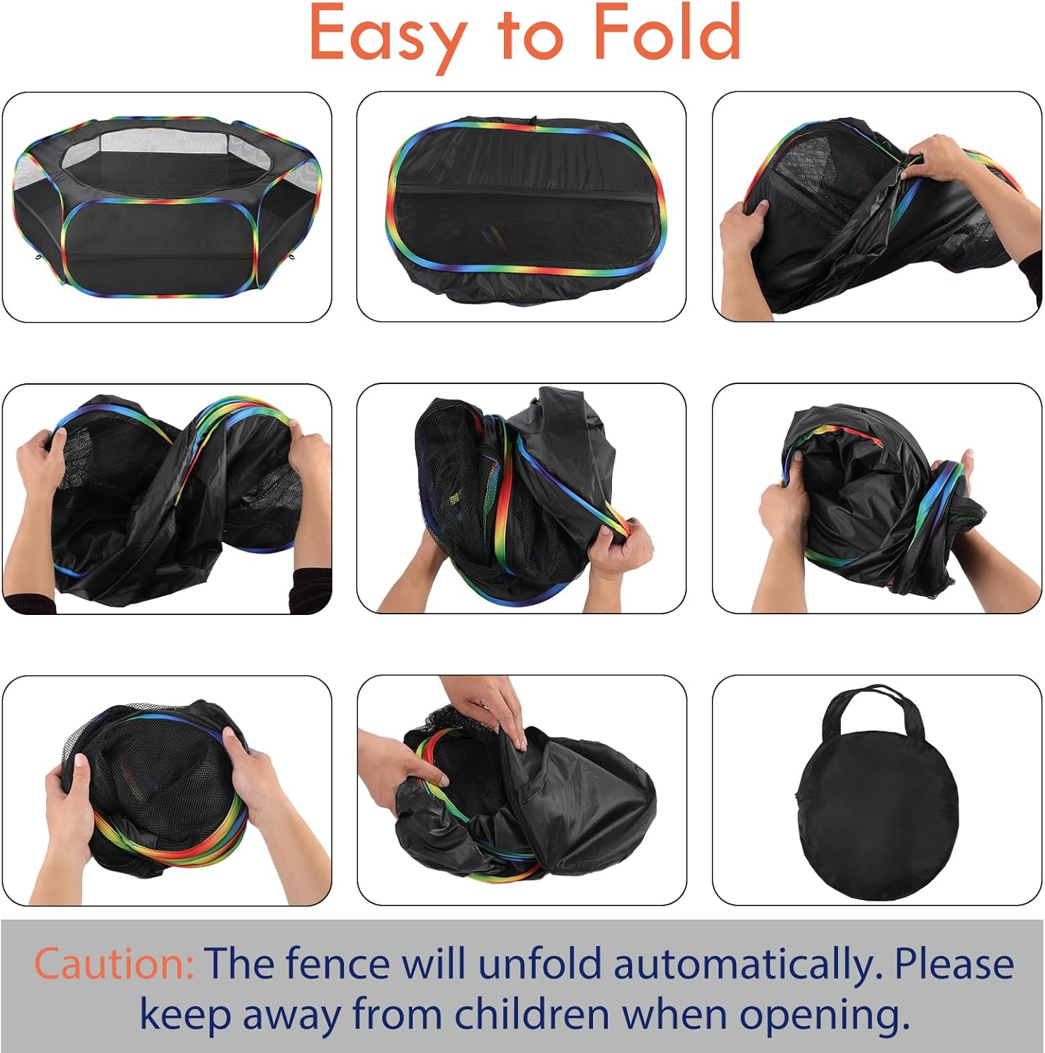 - γ NO FUSS - POP OUT IN SECONDS γοΌNo need for complex splicing, because the fence will unfold automatically, built-in frame pops open in seconds (NOTE: Please keep away from children when opening due to the spring pressure). Folds back flat when not in use for easy carrying and storing.