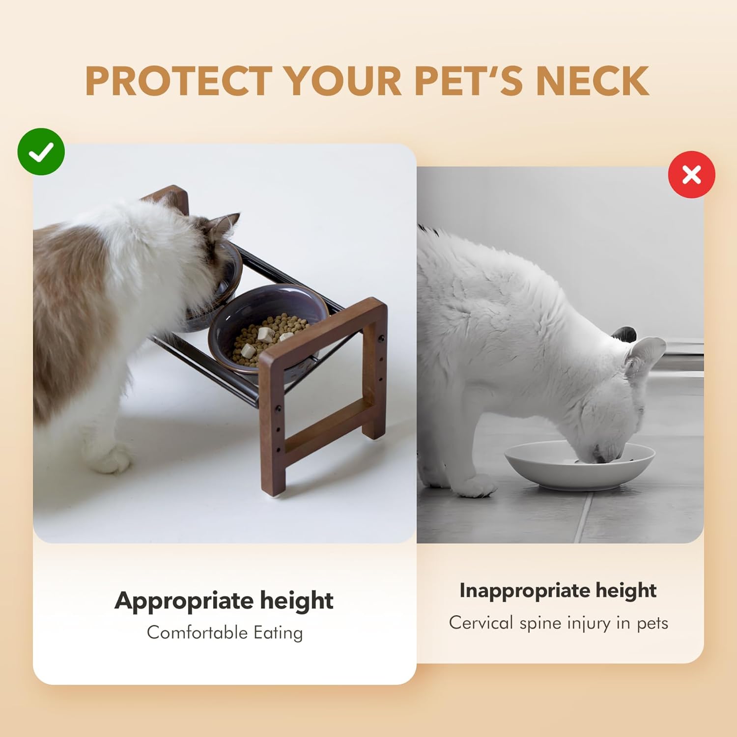 - 3 Adjustable Heights & 2 Placement Options: This stand offers 3 adjustable heights, ranging from 5.5 inches to 8.7 inches, catering to the needs of pets at different growth stages. The circular metal component on top of the stand features two distinct placement options, allowing the bowls to be either horizontally aligned or tilted. Our products are designed to help protect the pet's cervical spine and meet their diverse needs.