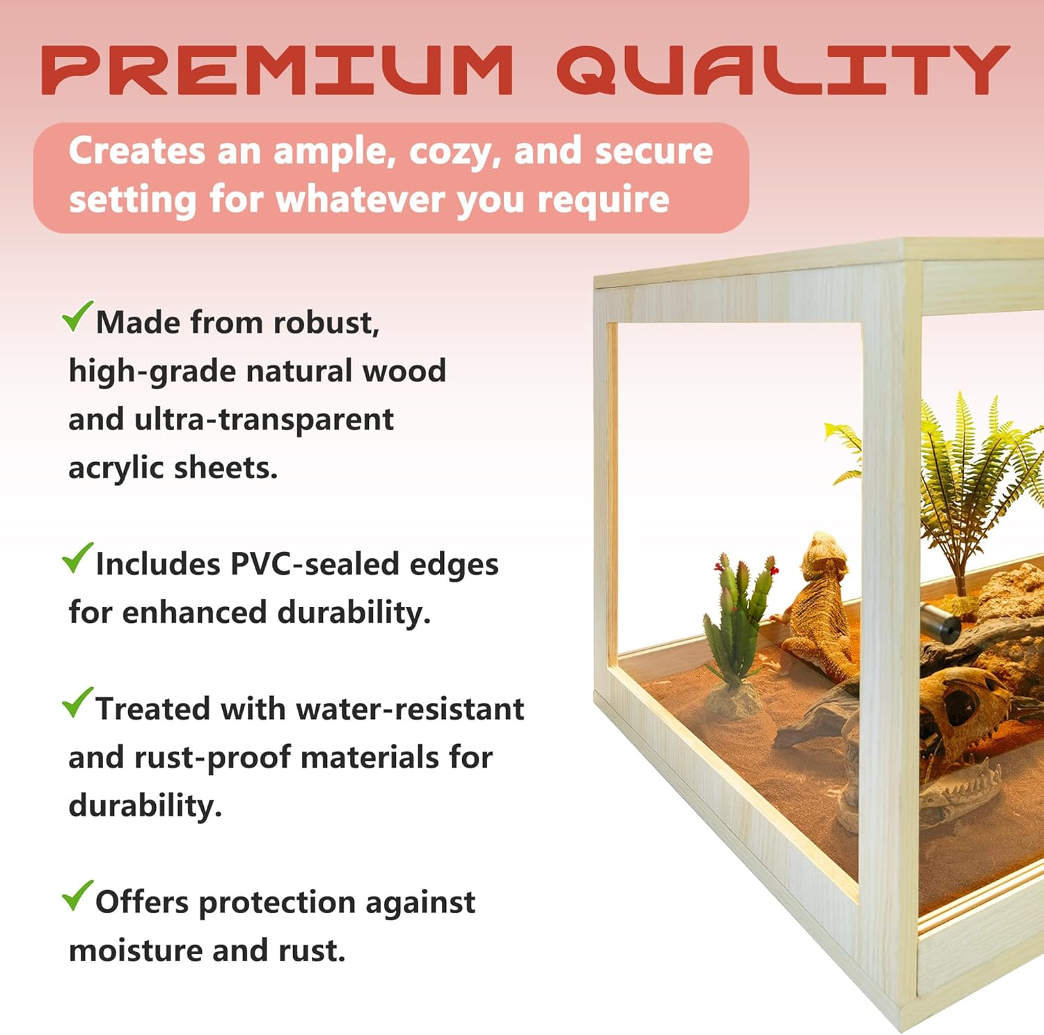 - 【Premium Reptile Habitat】For reptile enthusiasts looking for the best living space for their scaly pets, our premium reptile enclosure is an outstanding option. Made from high-quality solid wood coated with waterproof polyester and reinforced with acrylic elements, this habitat ensures a secure and comfortable environment for your scaly companions. Please note, this enclosure is specifically designed for terrestrial reptiles and is not suitable for aquatic use.