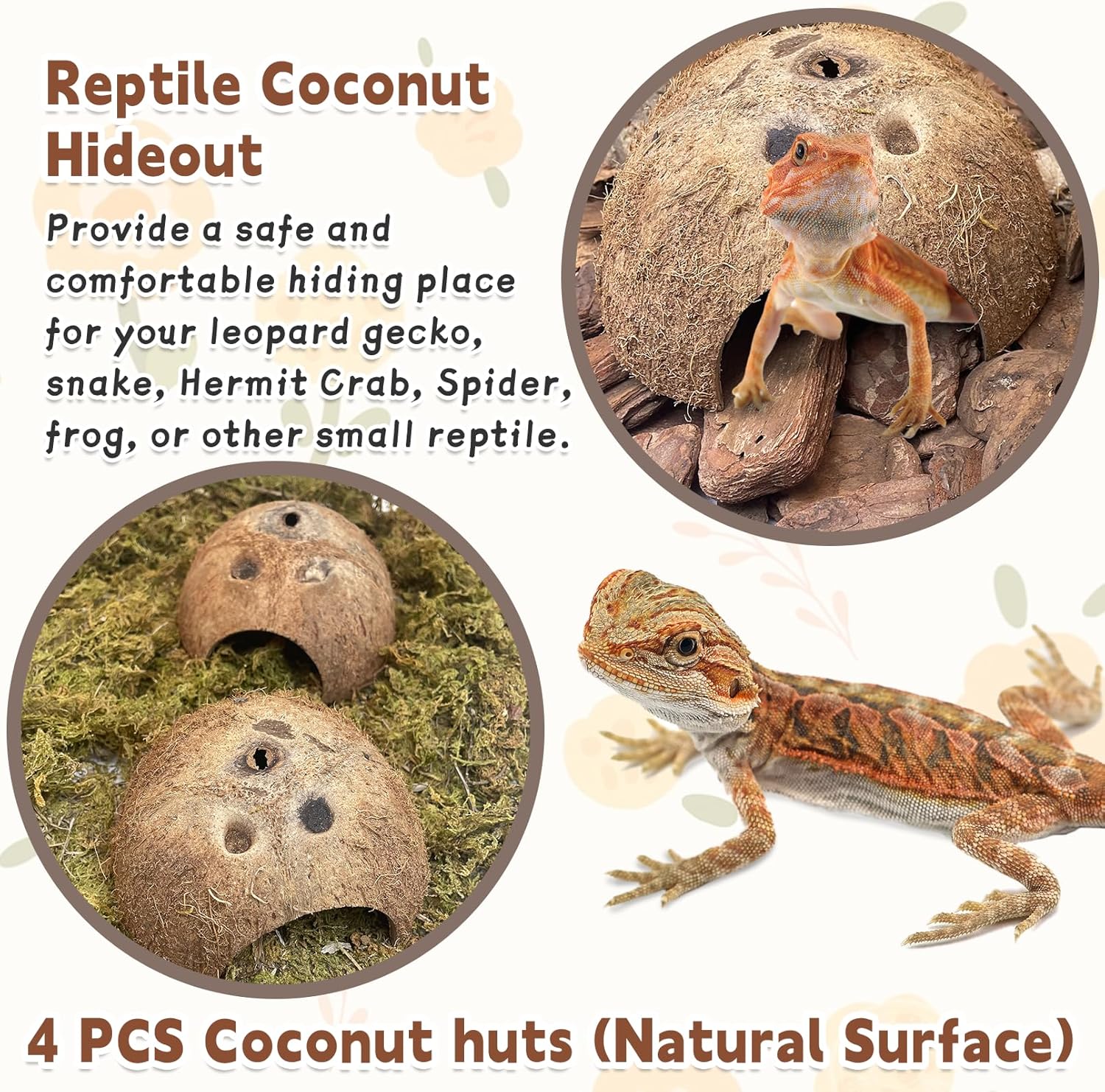 PINVNBY Natural Coconut Reptile Hideouts Lizard, Coco Hut Hermit Crab Hut Aquarium Fish Hide Cave for Small Reptile Crested Gecko Leopard Gecko Spider Snail Climber Toys (4 PCS Natural Surface)
