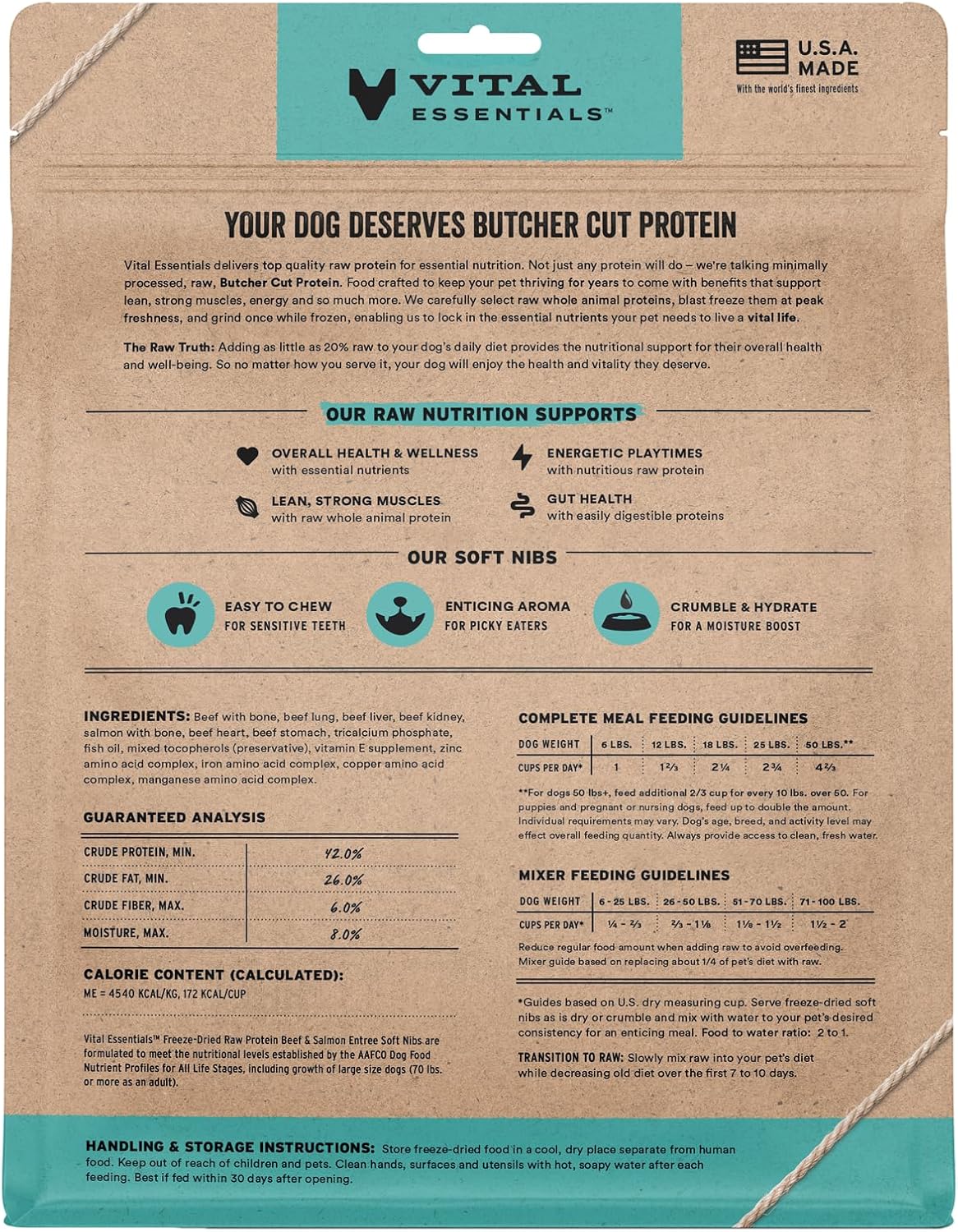 - SOFT NIBS FREEZE-DRIED RAW BEEF & SALMON DOG FOOD: Vital Essentials Freeze Dried Soft Nibs Dog Food packs more protein than industry standard into every soft bite to deliver the peak vitality your dog deserves, especially when compared to dehydrated dog food. This complete and balanced freeze-dried raw dog food is made with premium Butcher Cut beef and salmon, responsibly sourced in the USA.