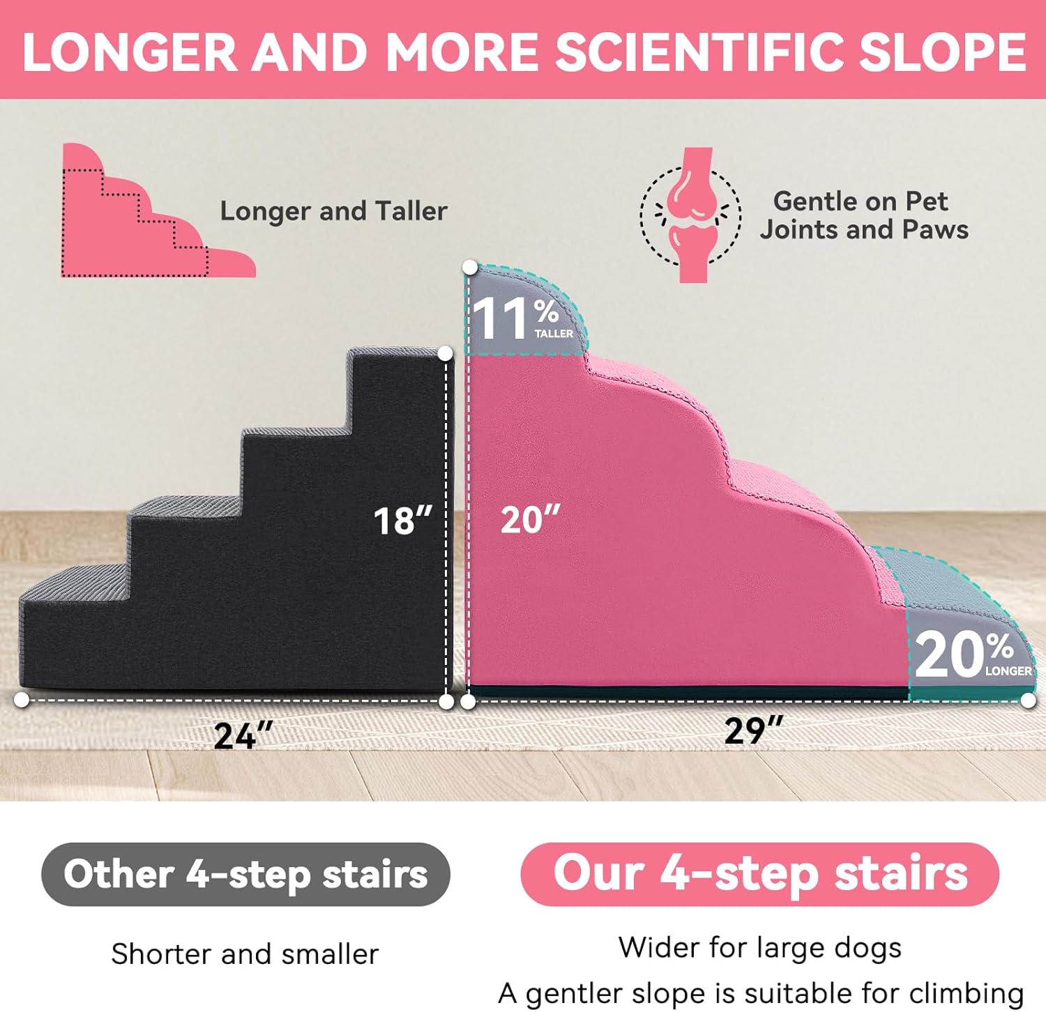 Dog Ramp and Stair for Bed 16" H-20 H,3-Step Cat Stair for Sofa and Chair,4-Step Dog Ramp for High Bed and Window,Durable Nonslip Fabric Cover for Indoor (Pink-20 H, Pet Friendly, 4)