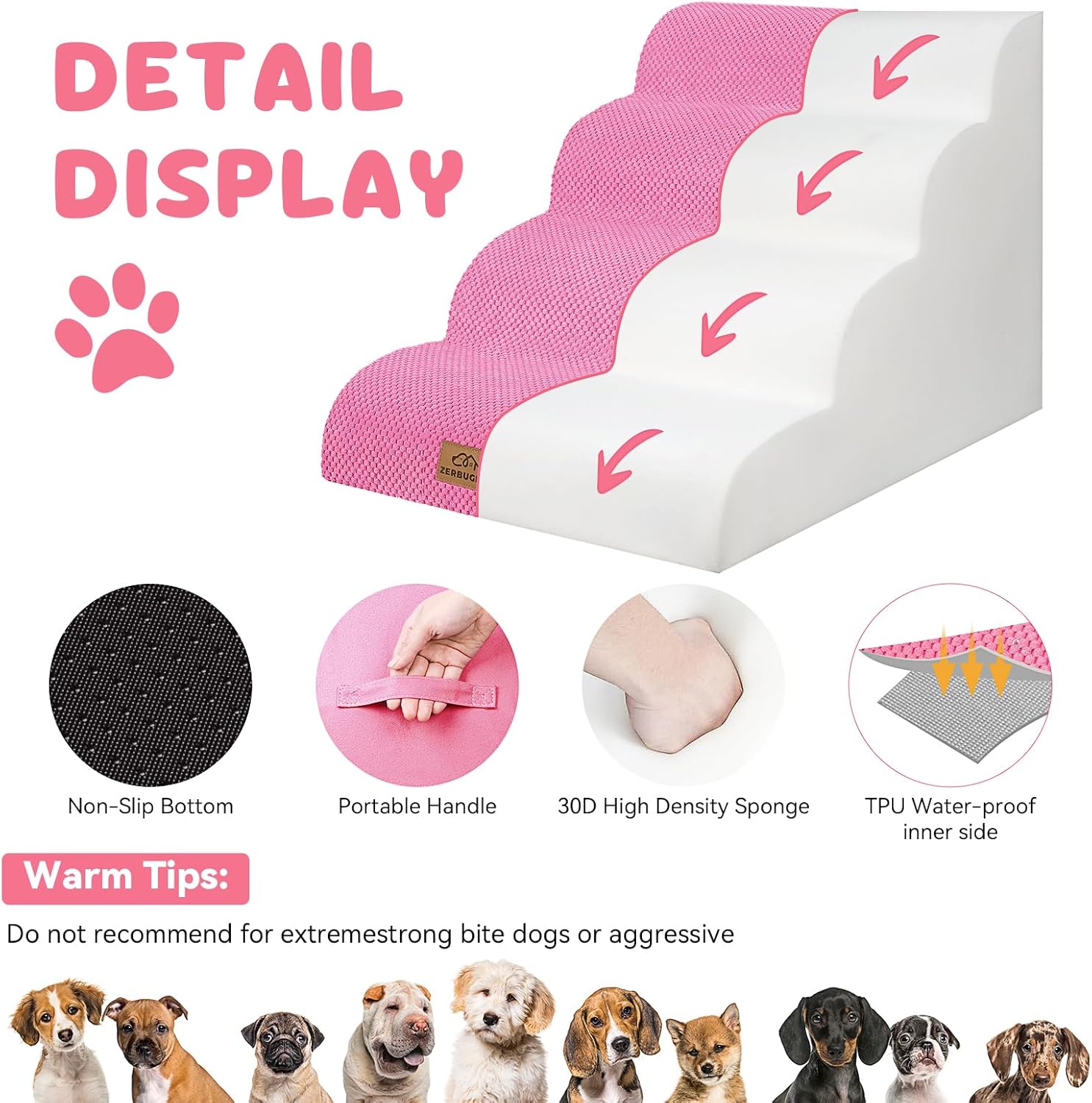 - Ideal Choice for Furry Friends Indoor: Pet owners, pay attention! If your furry friend is elderly, short-legged, injured, or a small cat or dog, Zerbuger Dog Stair is a must-have item for you. It's extremely suitable for indoor use and works great in living rooms or bedrooms. Small pets love it, and it's very useful when taking care of pets. With our stair, pets can easily and safely climb up and down high places like sofas, chairs, beds. Our pet step can also teach dogs to climb and allows pets to reach the window to enjoy the view.