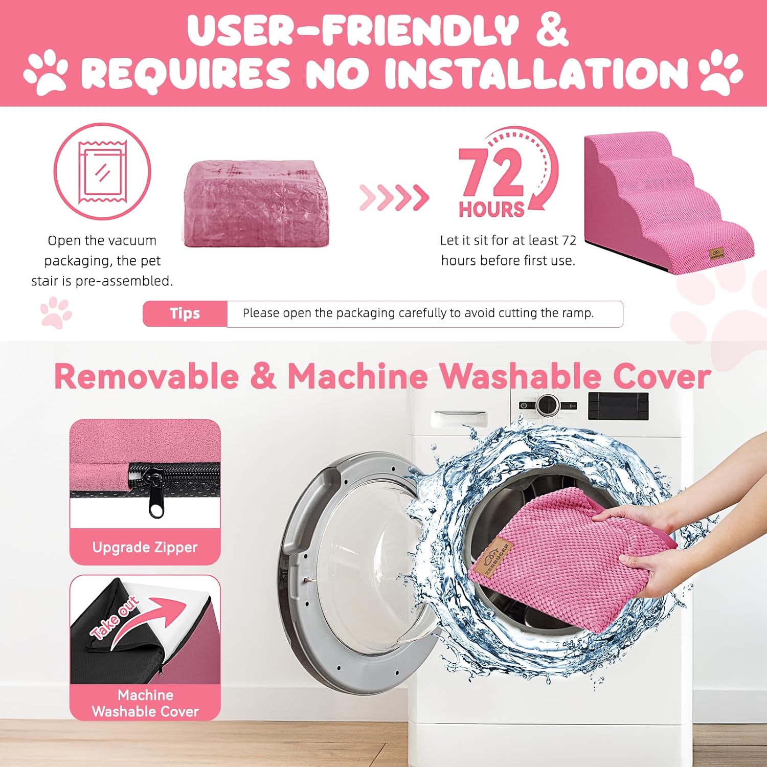 - No Assembly Required & Easy to Clean: When you open the packaging, the pet stair is already assembled. Before the first use, it should be left standing for at least 48-72 hours for the foam to fully expand. NOTE!! Open the packaging carefully to avoid cutting the stair! The outer cover can be removed for cleaning and supports machine washing or hand washing. Please note that the inner foam is not washable.