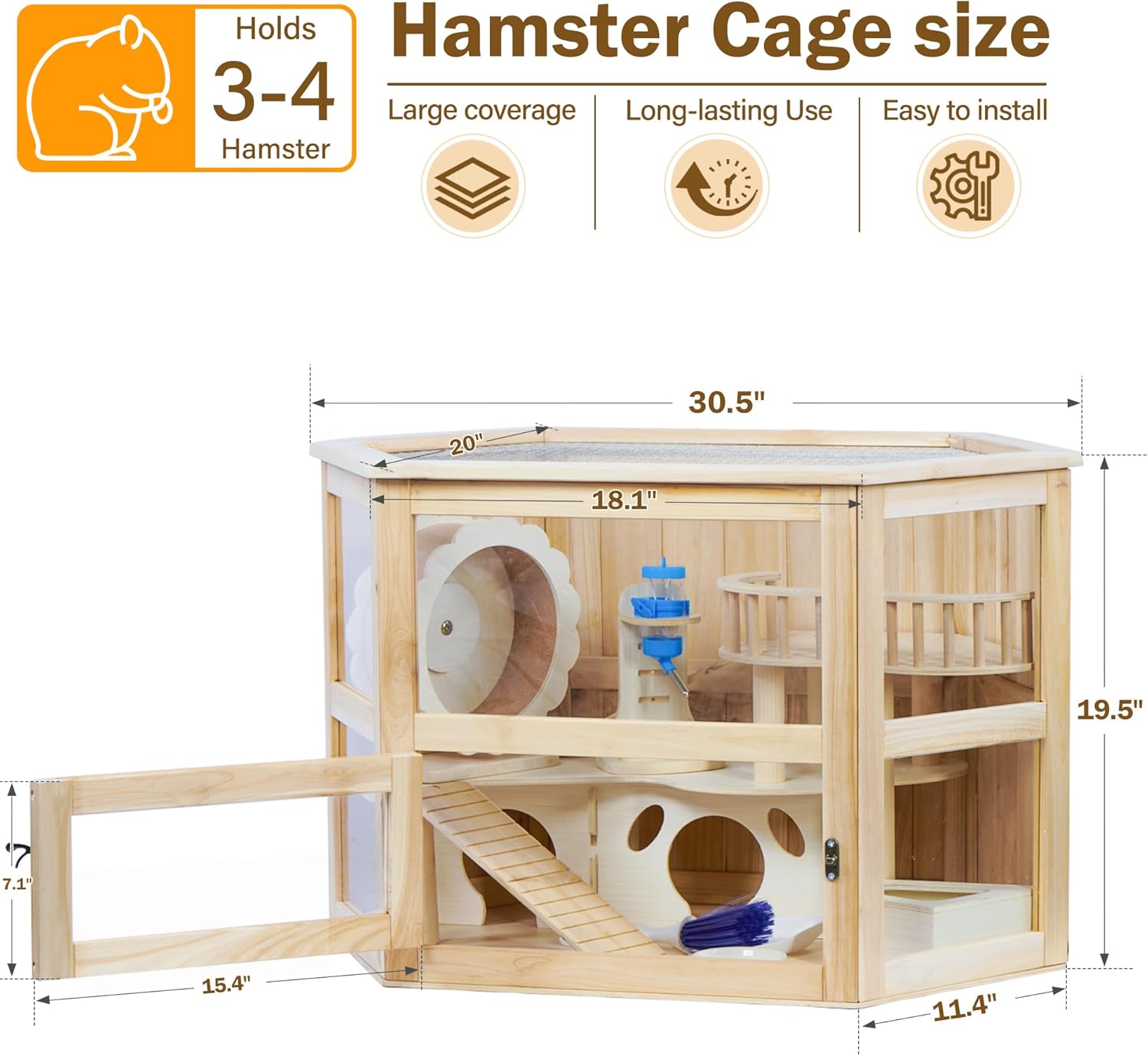 - Spacious Dimension:This large hamster cage features a 3-tier design,with extra large interactive space of this hamster cage wooden can comfortably accommodate thick bedding and a range of toys for your pets to burrow and explore;enabling you to create a well-suited habitat for your hamster