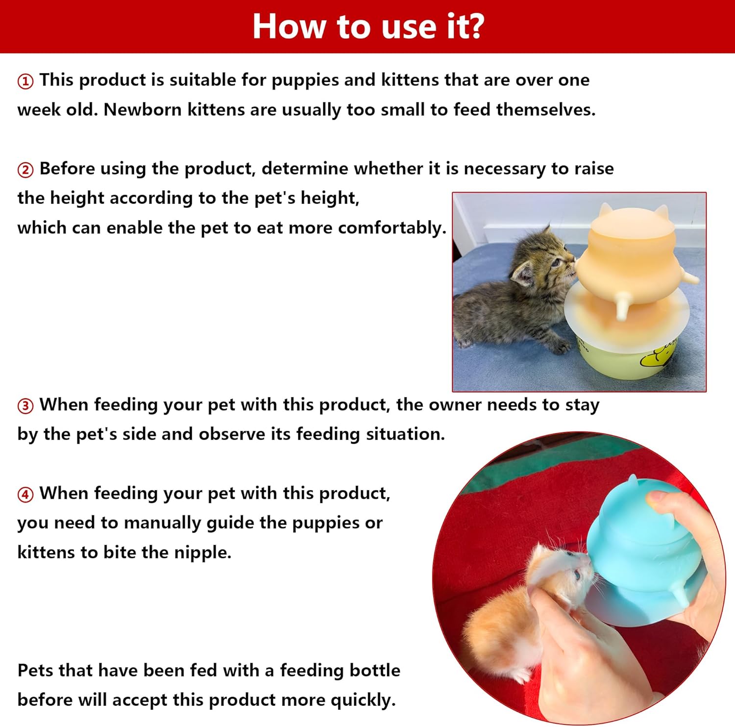 - Features: This product can feed multiple puppies, kittens and other pets at the same time. Its height is suitable for puppies and kittens. The base is designed with suction cups to prevent movement