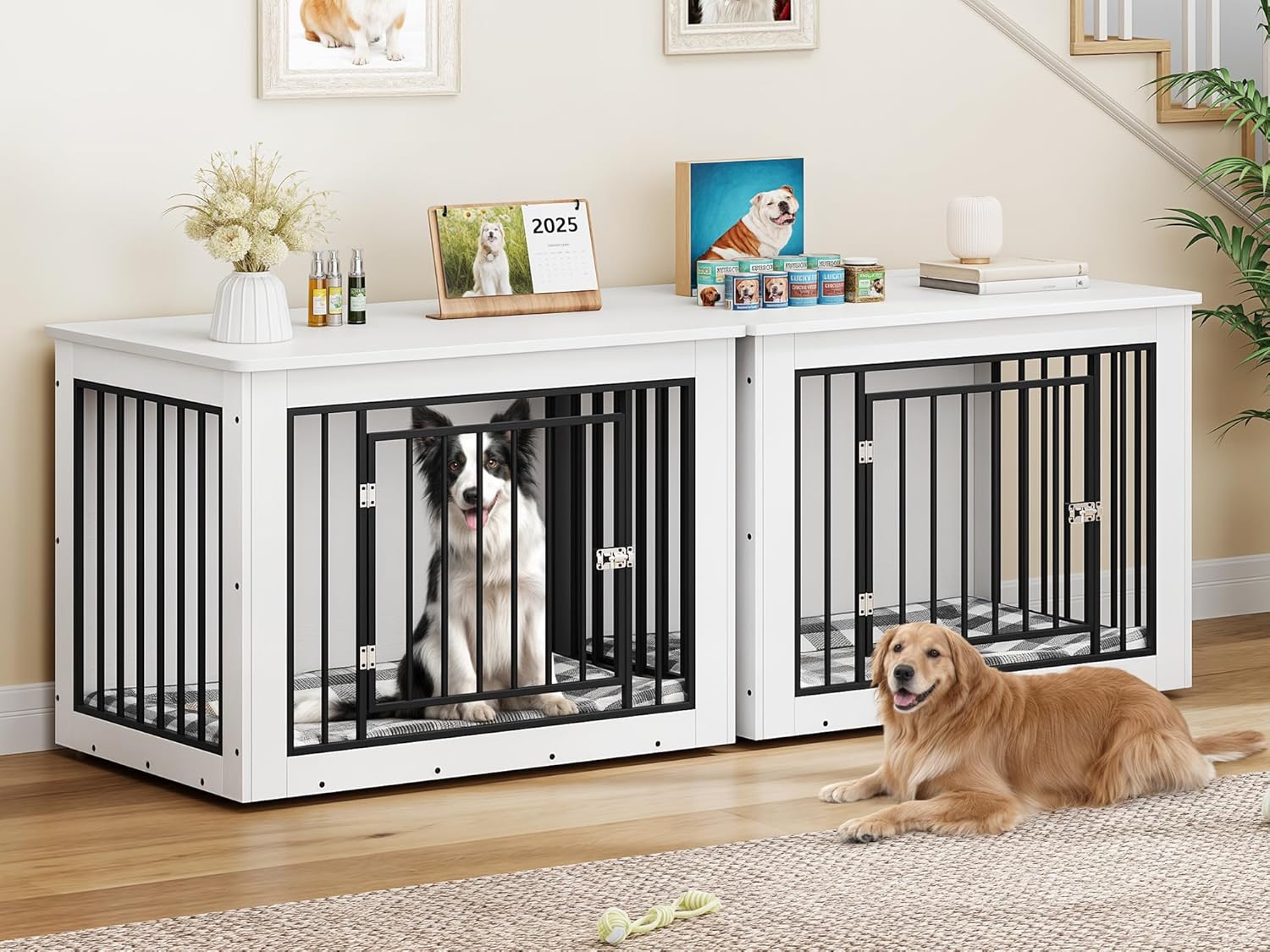 YITAHOME 76 Inch Double Dog Crate Furniture, XXL Dog Crate Furniture for 2 Dogs, Side End Table, Waterproof Top, Safety Corners, 2-in-1 Iron-Wood Fusion Dog Kennel Furniture for 2 Large Dogs,White