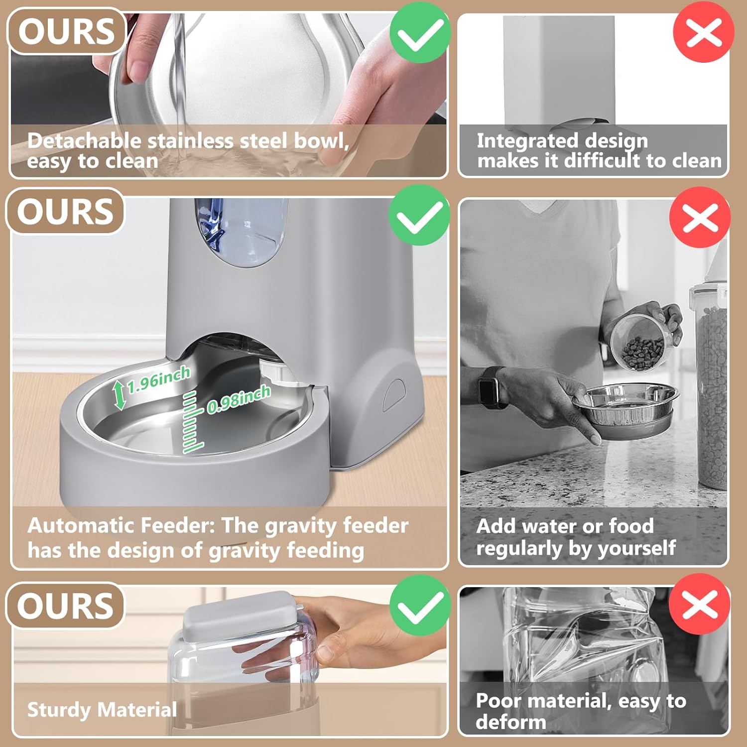 - Gravity Feeder:This auto dispenser combo uses the power of gravity to slowly refills water or food to bottle by gravity.You can rest assured to go to vacation, work, party, don't worry that pets will be hungry