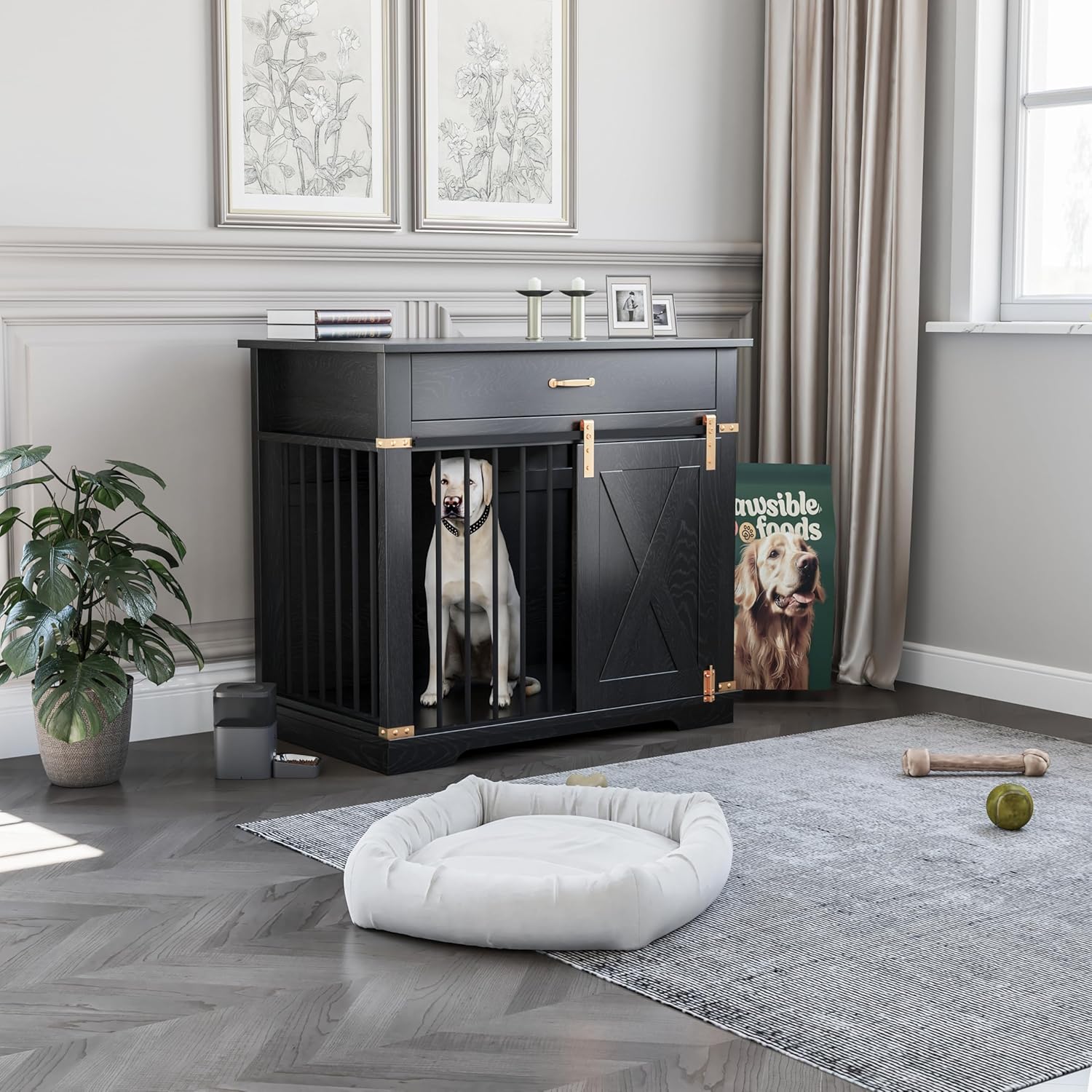 - Convenient Storage & Space-Saving Design: Equipped with a practical drawer storage area, this dog crate helps you organize your pet’s toys, food, and essentials neatly. The sliding barn door design ensures easy access while saving space, making it a perfect fit for any room.