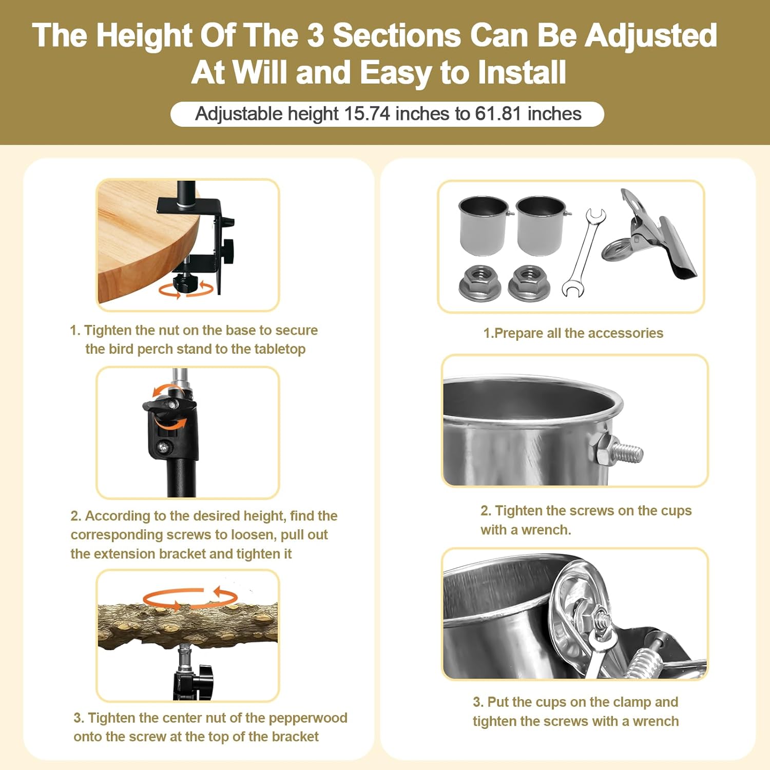 - Height Adjustable: The height of bird perch stand can be adjusted arbitrarily from 18 inches to 27 inches, freeing your bird from the inside of the cage and giving you the opportunity to have a more zero distance interaction with your feathered friends