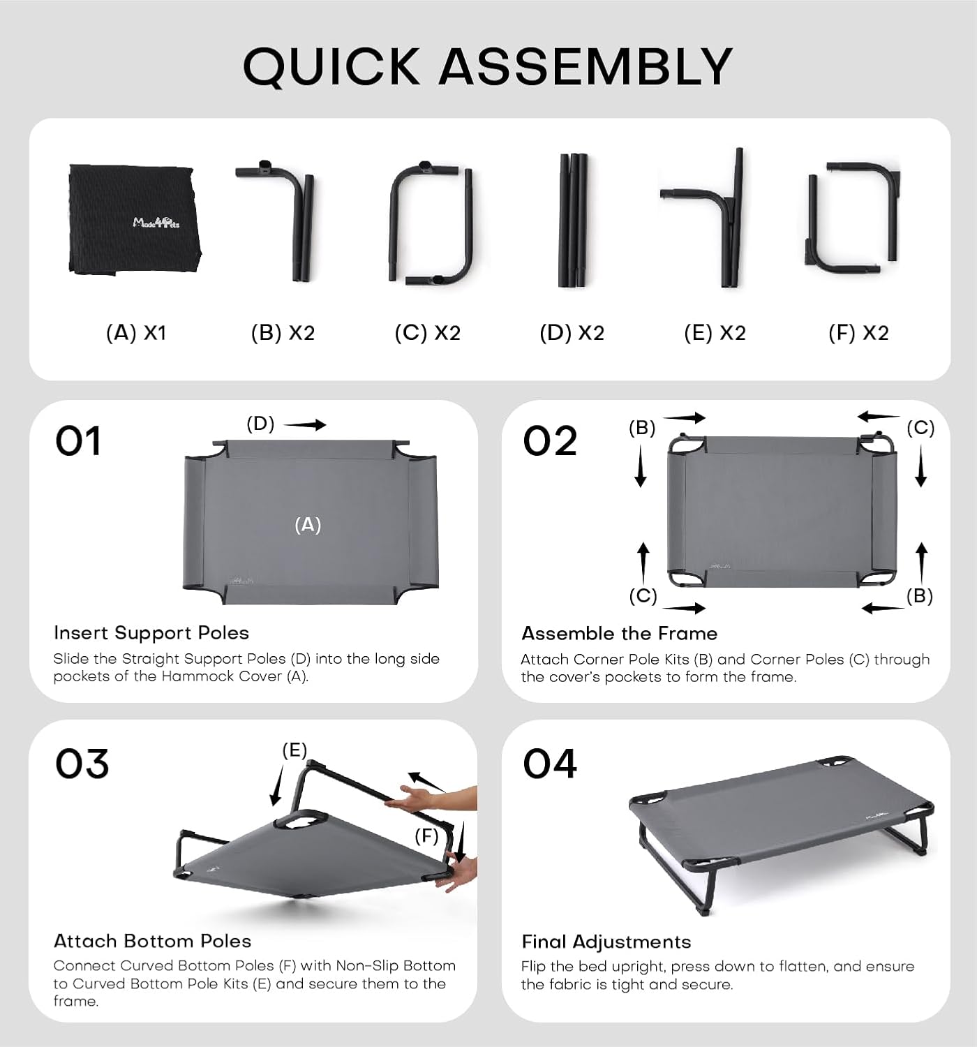 - Tool-Free, Hassle-Free Setup - No screws or tools needed—just slide and click. The plug-in design allows for fast, frustration-free assembly. Whether you're at home or packing for a trip, this easy-to-assemble elevated dog bed sets up in minutes